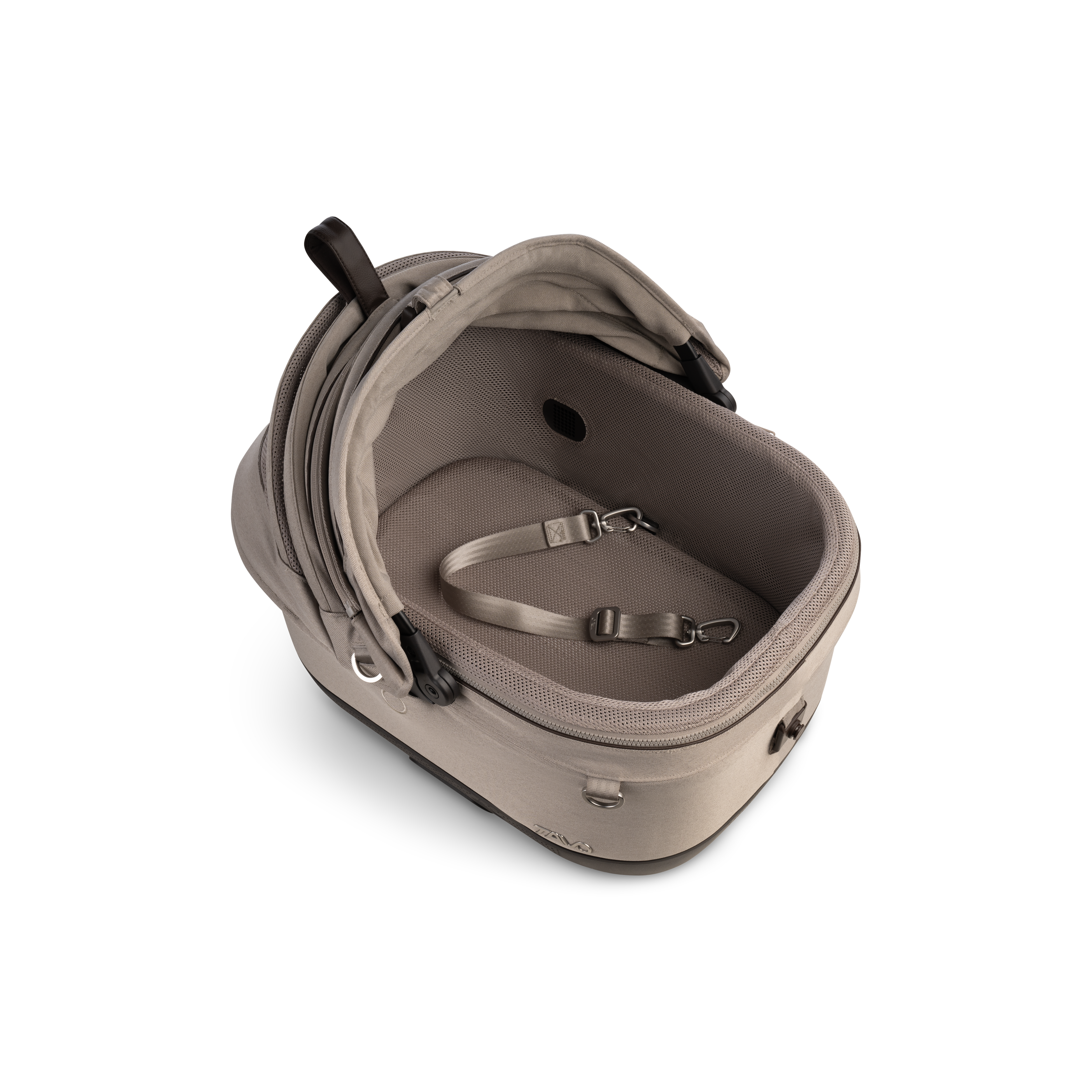 キャリアの天井となるキャノピーは左右どちらからでも開閉可能。UPF50+素材でペットの紫外線防止にも