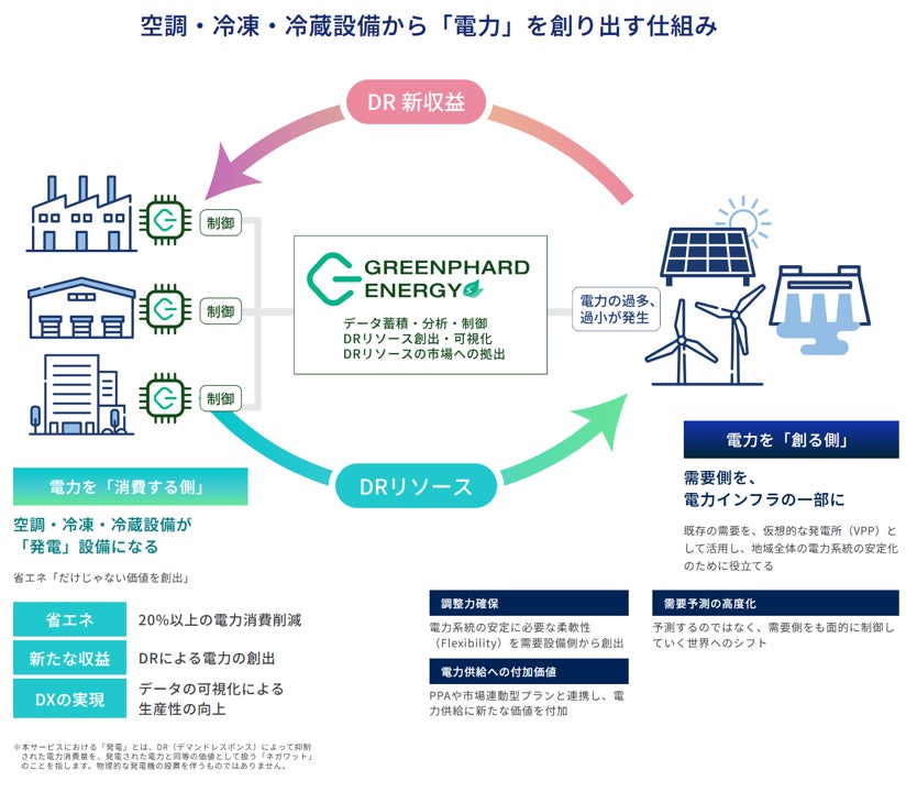Greenphard Energyは、最先端のIoT技術と電力市場の最新スキームである仮想発電所(VPP)の仕組みを融合し、冷凍・冷蔵・空調を「電力を生み出す装置」へと進化させています。これらの設備を地域単位で統合・制御することで、街全体をバーチャルな発電所として機能させ、地域全体の電力の安定供給とクリーンエネルギーの普及に同時に貢献。さらに同時に最大20%以上の省エネと設備のデジタル化をも実現します。