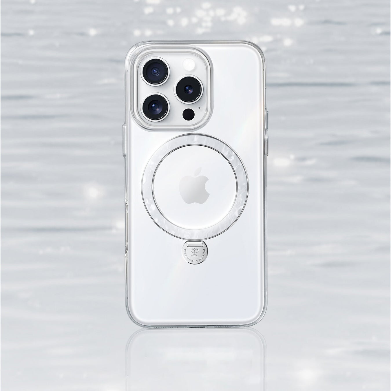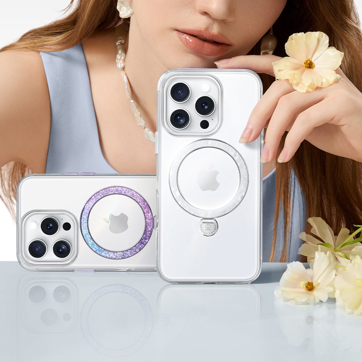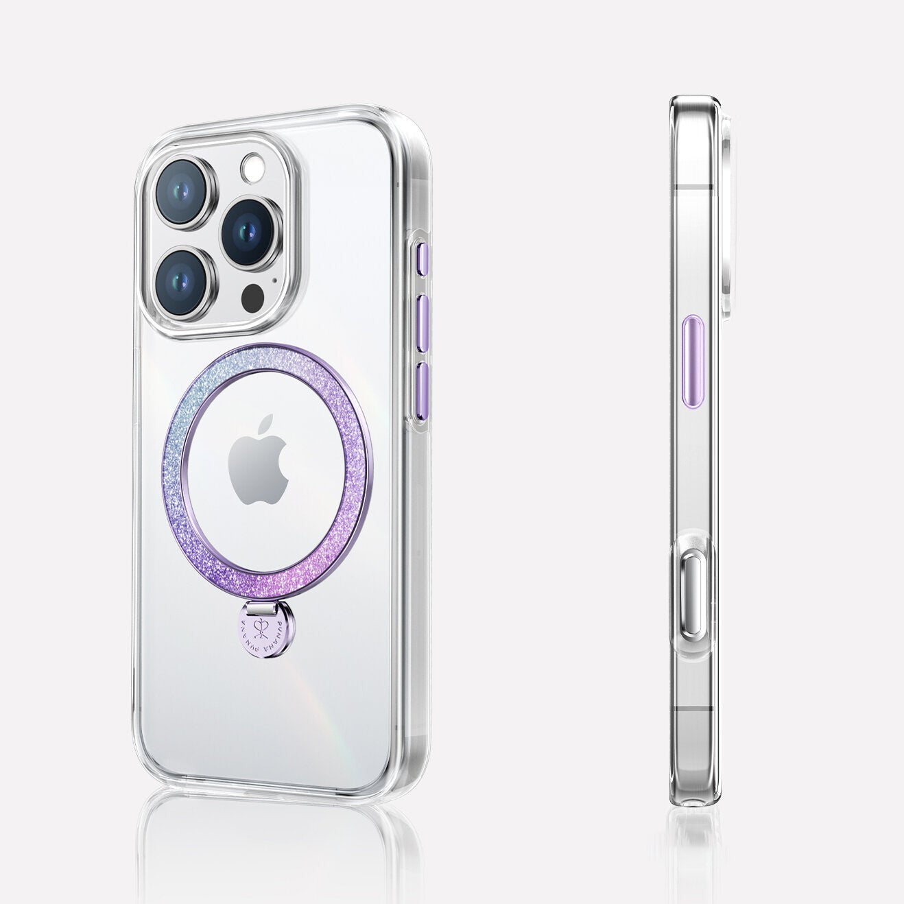 デザインインスピレーションは、空中でねじれるクリスタルライトの息を呑むような光景から得ています。 スタンドにもなるリングホルダー付き。 パープルは、オーストリアンクリスタルを埋め込み、 ホワイトは、パールに輝くシェルを想像させる光沢感のある輝きです。