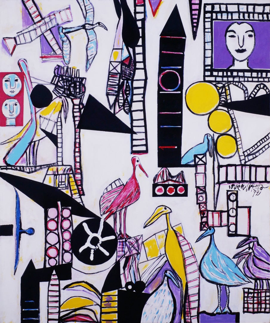 猪熊の画業は約70年にわたり、彼が生きた時代や環境を映すように画風も変化していきました。晩年には、具象も抽象形態の集合体であり、形はすべて面白く美しいバランス でできていると考えた、さまざまな形が共存する絵画に到達します。 本展では、猪熊が80歳を超えて制作した、丸や四角と、顔や鳥といった生き物の姿が区別なく描かれ、さまざまな形 が共存する作品をご紹介します。