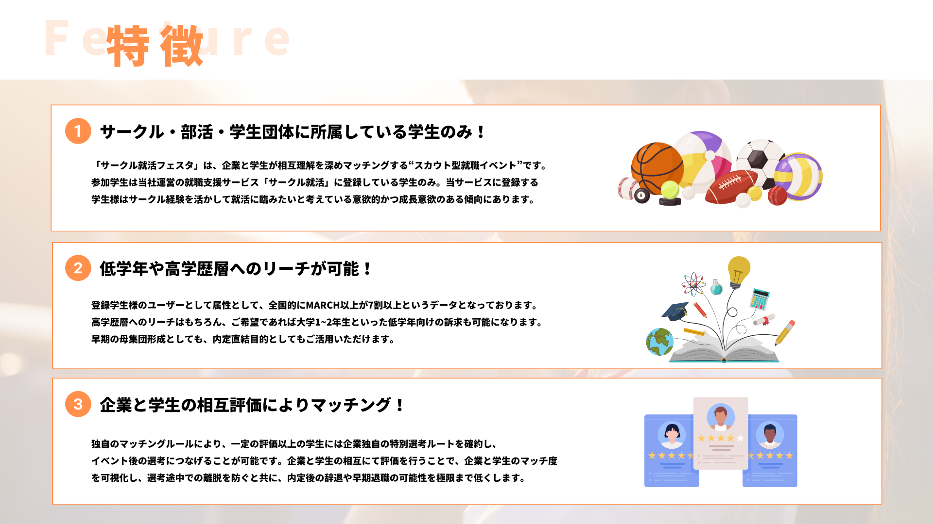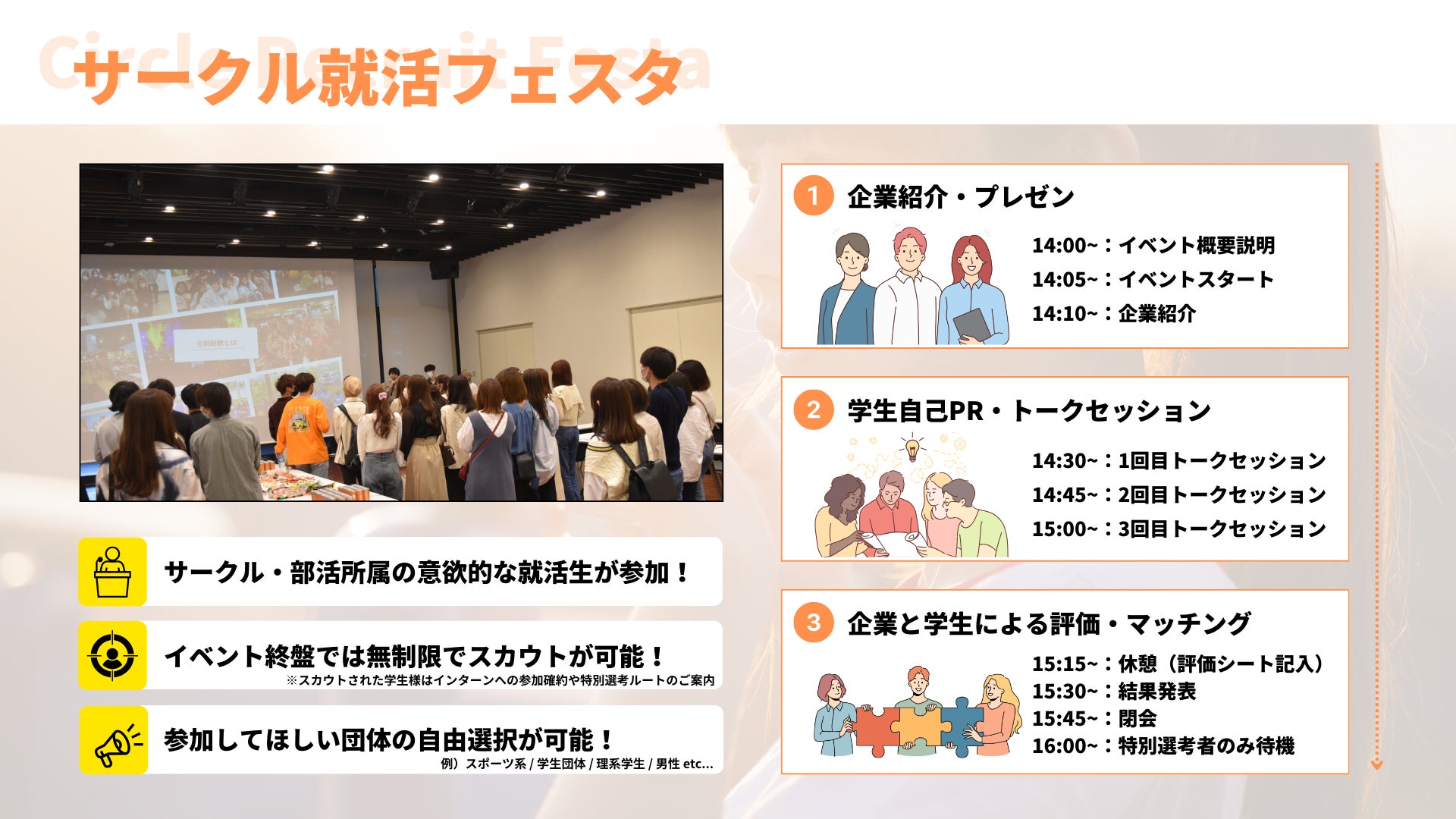 「サークル就活FESTA」とは、企業と学生が相互理解を深めマッチングする“スカウト型就職イベント”です。