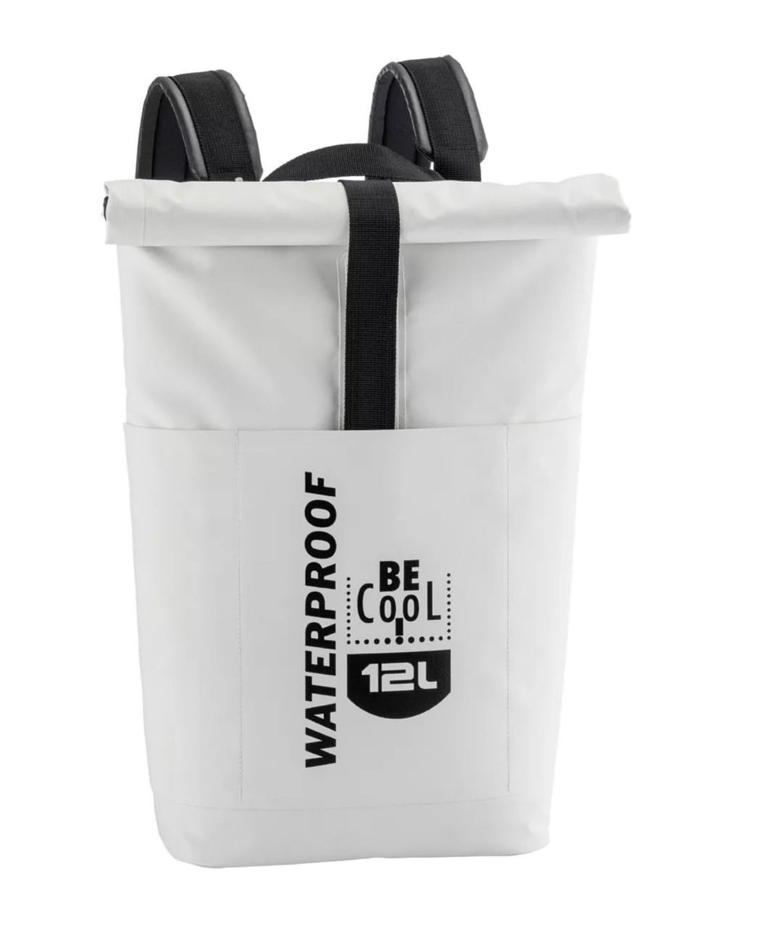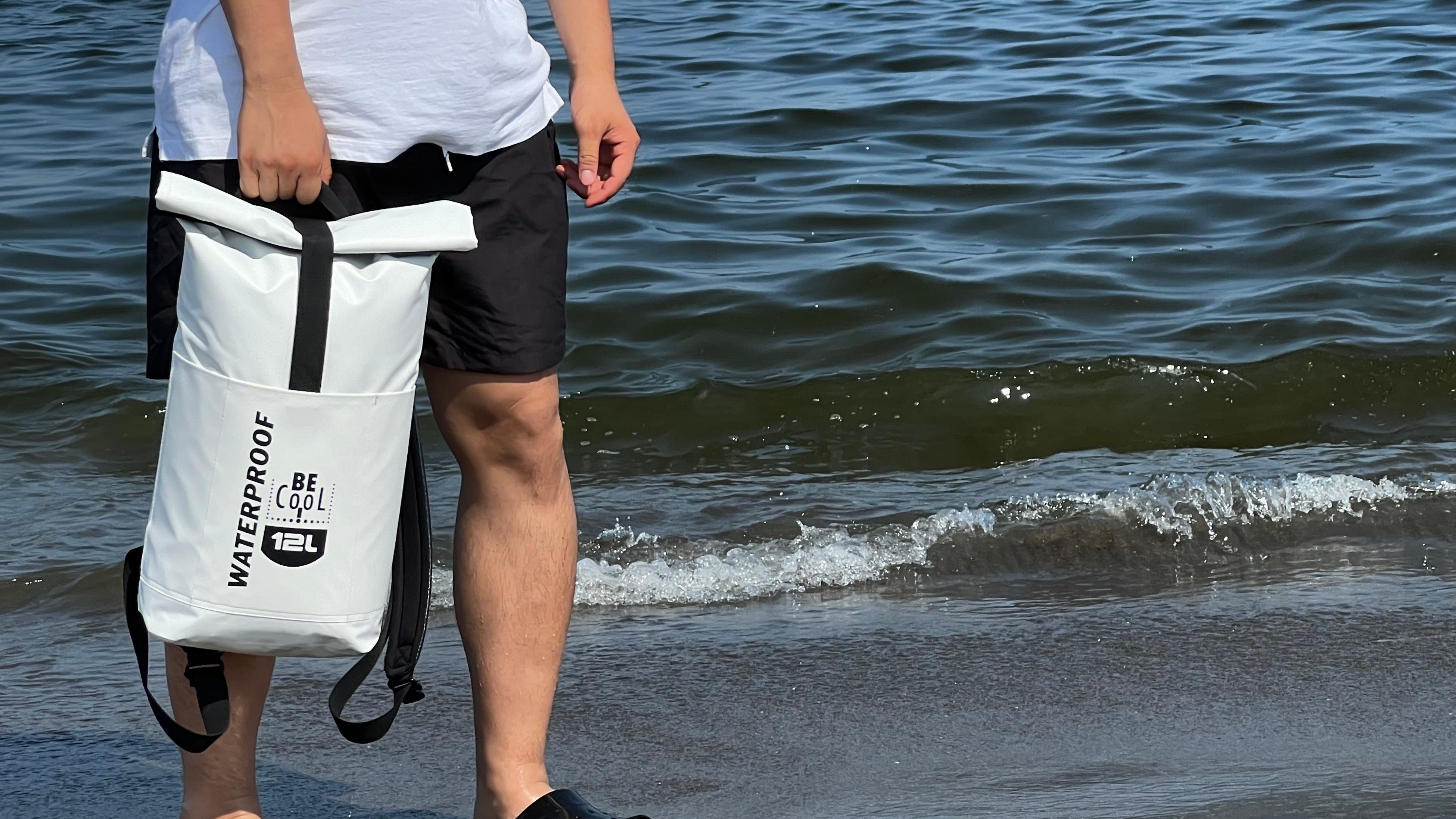 この商品は12Lと3Lの2つのタイプがあり、それぞれの用途に応じてお選びいただけます。12Lバッグはリュックタイプで、背負って持ち運びが可能です。シンプルな構造で使いやすく、700gと軽量です。広い開口部には面ファスナーとロールトップ式のデザインを使用しており、中まで水が入りにくくなっています。