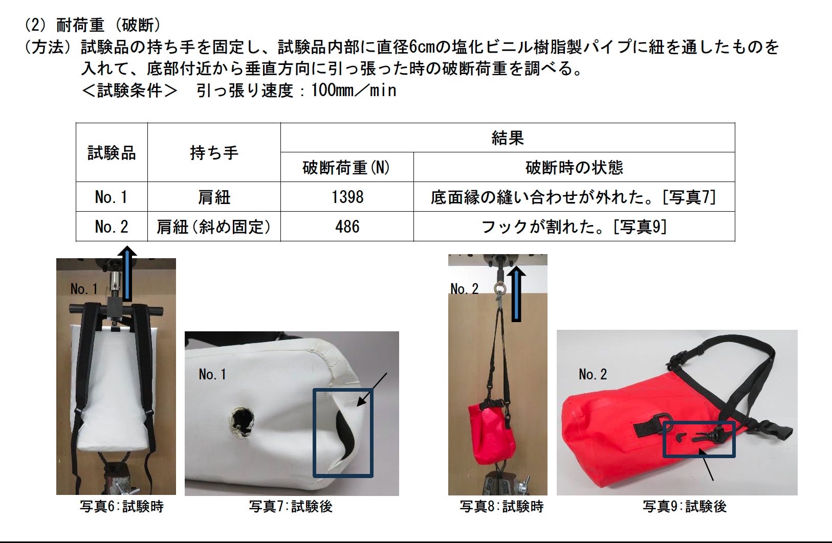 私たちは民間の調査会社に依頼し、このバッグの耐久性を試験しました。結果、12Lのバッグは10kg,3Lのバッグは5kgを24時間吊り下げても問題ありませんでした。アウトドアなどのタフな状況にも十分に耐えられます。