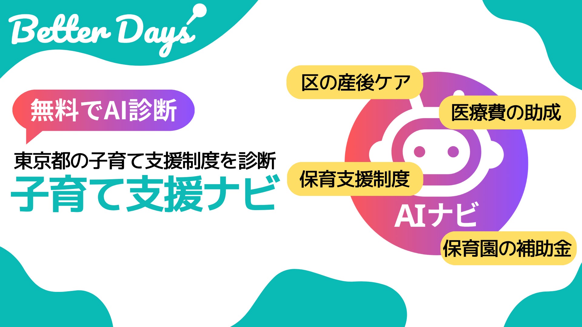 株式会社BetterDays(代表取締役:大川未央)は、子育て世帯を応援するため、東京都内の各区が提供する子育て支援制度をAIが提案する無料サービス「子育て支援ナビ」を本日より提供開始いたします。
