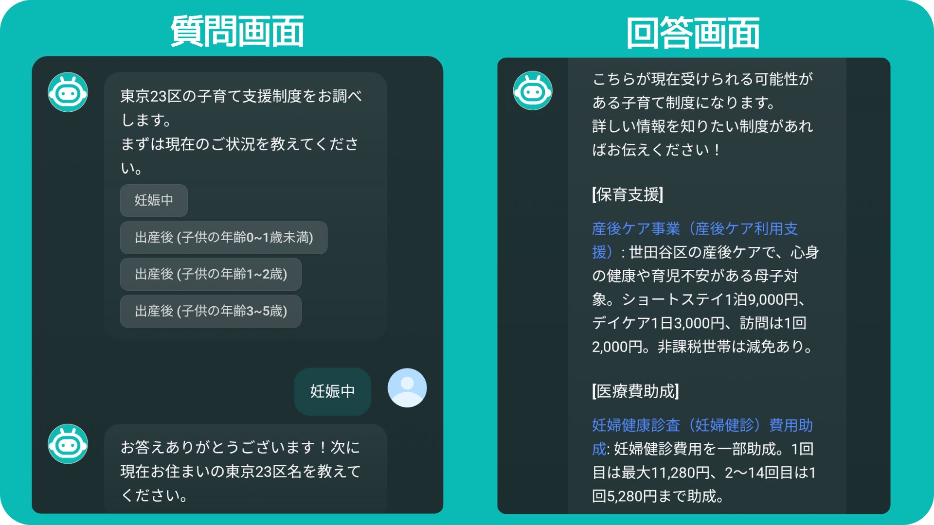 これらの課題を解決するため、東京都内の各区は、子育て世帯を支援するために、現金の給付や一時保育、医療費の助成などさまざまな支援制度を設けています。しかしながら、これらの情報は各区のウェブサイトに分散しており、且つ制度の内容も複雑であるため、時間的制約のある子育て世帯にとって、必要な情報を効率的に探し出すことは容易ではありません。