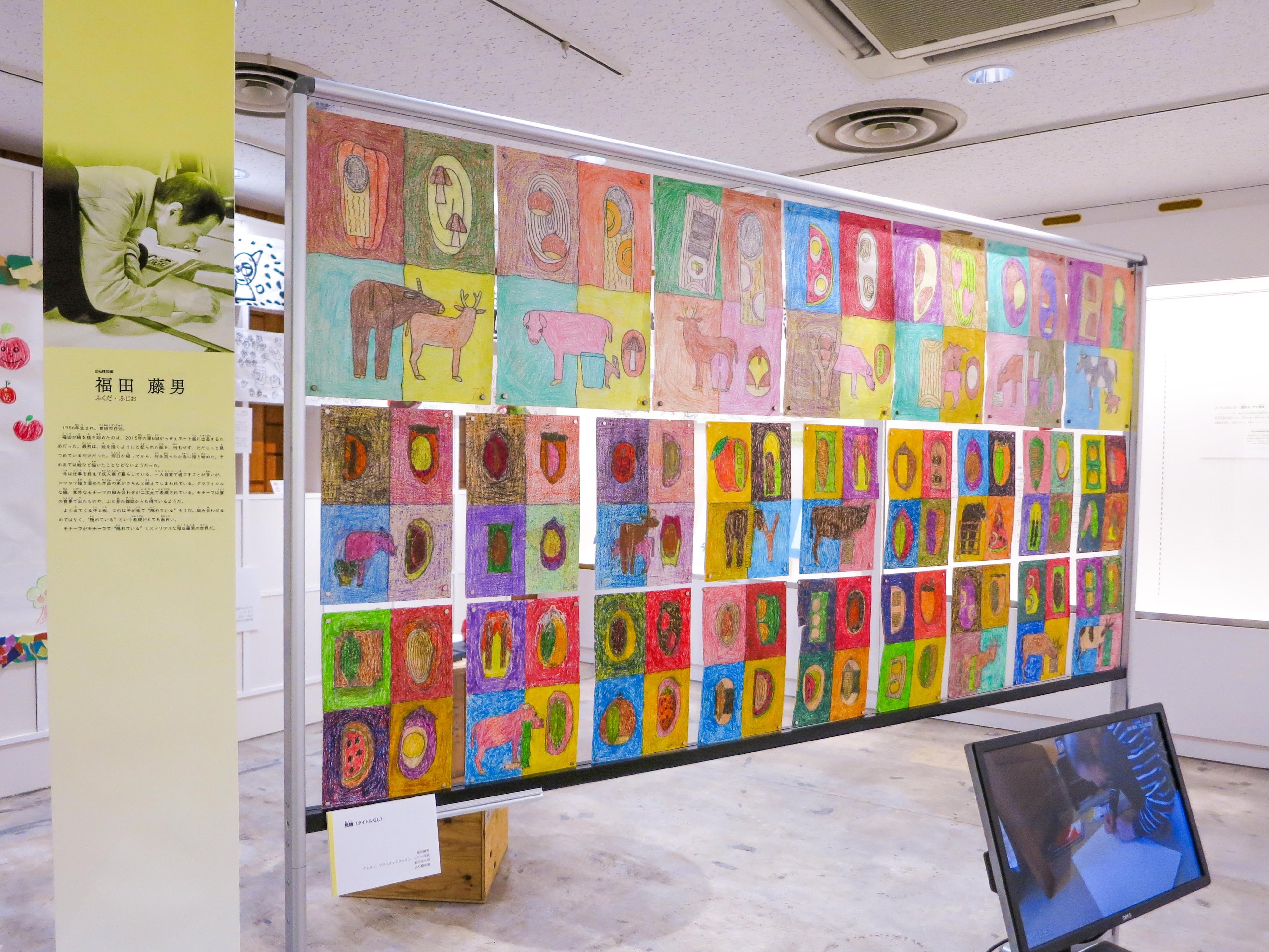 本展では、但馬地方を中心に障害のある方の芸術活動を支援しているNPO法人がっせぇアートと、特色ある美術授業を実践する神戸大学附属特別支援学校の作品が展示室を華やかに彩ります。どの作品も障害のある方によるものですが、だから「とくべつ」なものとして展示するのではありません。誰しもが送る「ふつう」の暮らしの中に、絵と向き合う時間がある、そんな時間を大切にしてくれる人や環境がある。美術を通して個性を引き出し、伸ばしてくれる教育がある。それらが「とくべつ」な作品を生み出しているのです。