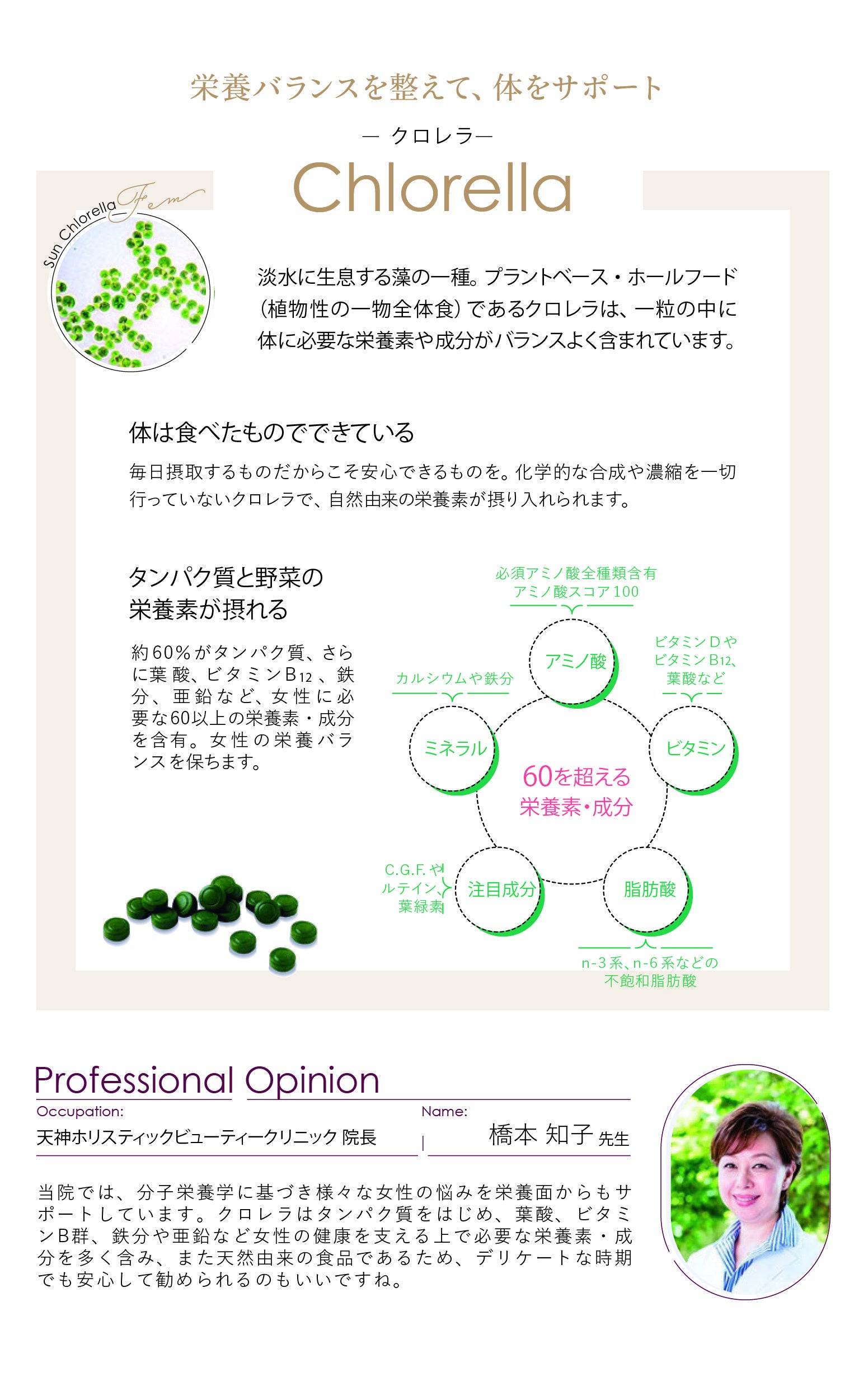 プラントベース・ホールフードであるクロレラは、淡水に生息する藻の一種。タンパク質を中心に、女性に必要な鉄分や葉酸、ビタミンB12など60以上の栄養素・成分をバランスよく含んでいます。ヴィーガンの方も安心してお召し上がりいただけます。