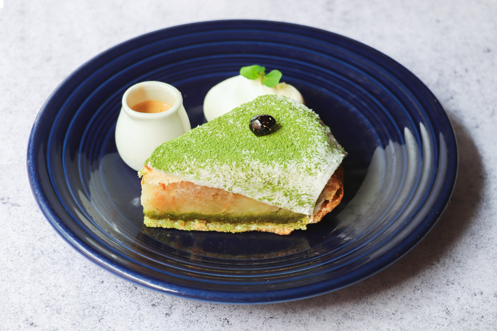 抹茶風味のアーモンドクリームに、上品な甘さの黒豆と青森県産りんごをたっぷりと重ね、なめらかなマスカルポーネチーズを合わせて焼き上げました。
