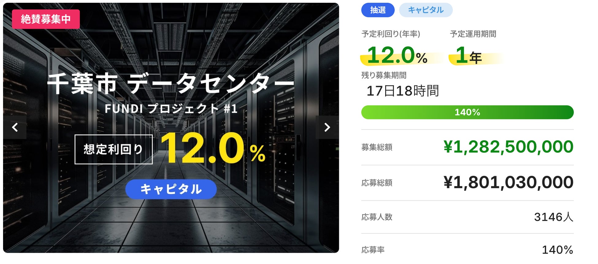 11/11にリリースした「FUNDI(ファンディ)」の初回ファンドである「千葉市データセンター FUNDI プロジェクト#1」は応募額が13億を突破し、応募率が100%を超えたことをお知らせします。
