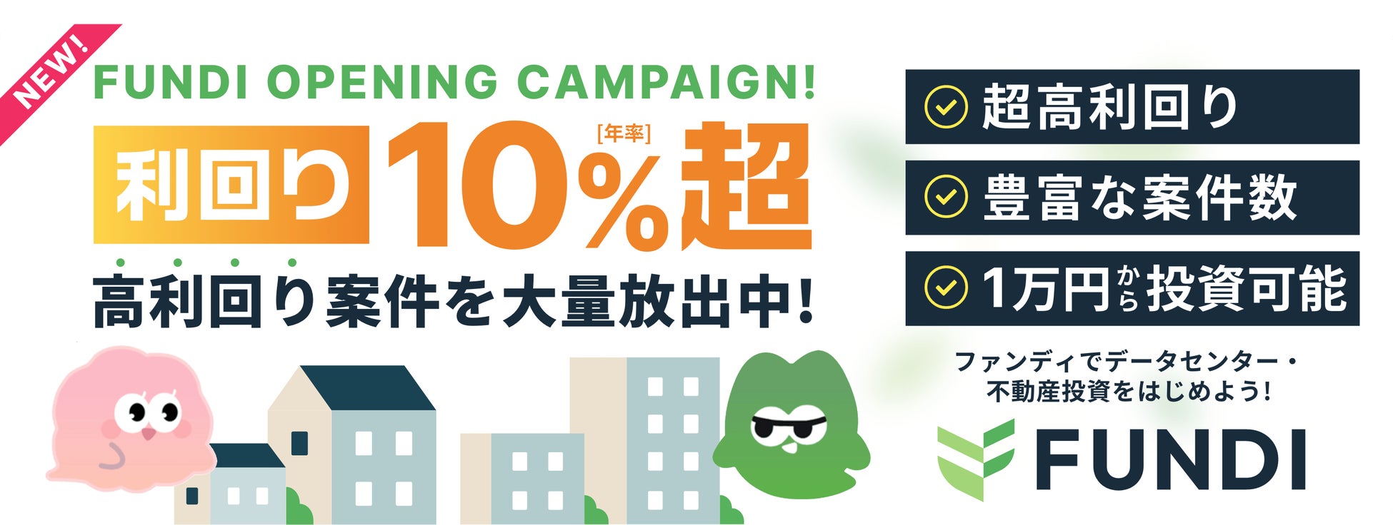 ※当社が運営するFUNDIが取り扱う案件は、元本が保証されているものではございません。各案件に係るあらゆるリスク等は投資対象によって異なりますため、投資へのご判断はご自身でお願い致します。