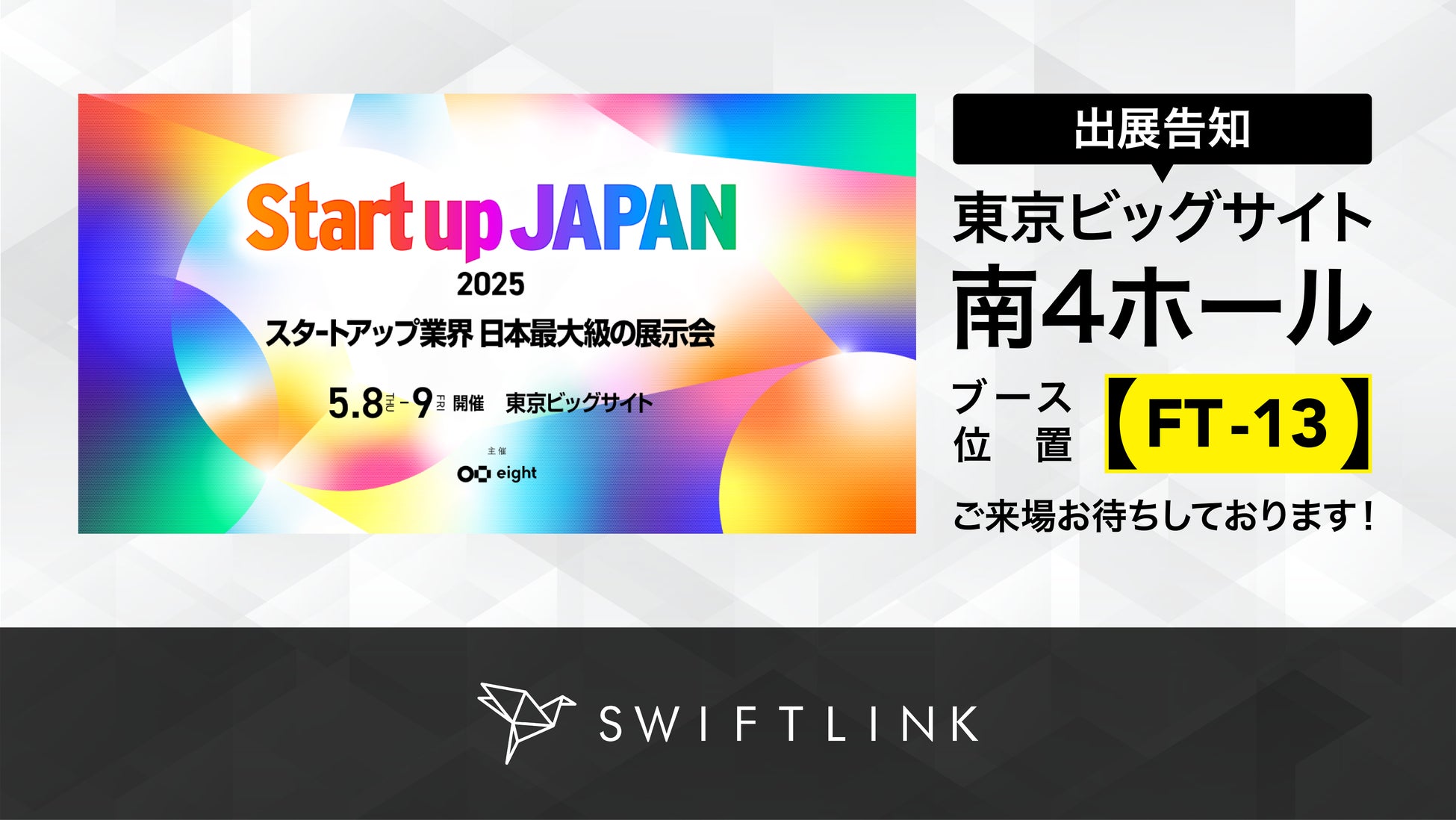 SwiftLink株式会社(本社:東京都中央区)は、2025年5月8日(木)から9日(金)まで、東京ビッグサイトで開催される「Startup JAPAN FUNDeal 2025」に、ブースを出展いたします。