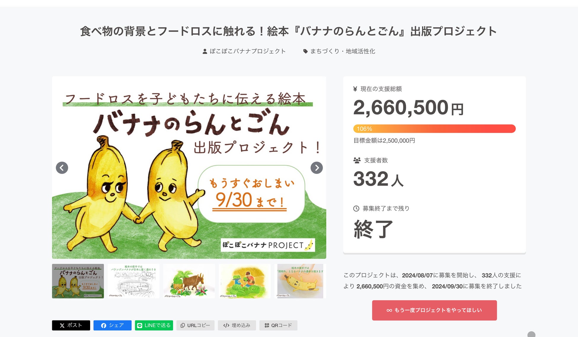 この絵本は、APLAの運営する規格外バランゴンバナナの利用を広げ、フードロスを削減する「ぽこぽこバナナプロジェクト」の一環として制作されました。昨年8〜9月にはクラウドファンディングで資金調達を行い、約2カ月で、332人の方から、266万500円の支援をいただきました。