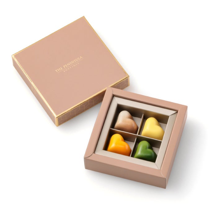 ザ・ペニンシュラ東京のエグゼクティブ ペストリーシェフがレシピを監修。人気のマンゴープリンをイメージしたボンボンや、柚子や抹茶など和の素材を使用した上質なボンボン4種類を詰め合わせた限定ボックスです。(カフェ、柚子、抹茶、マンゴー)