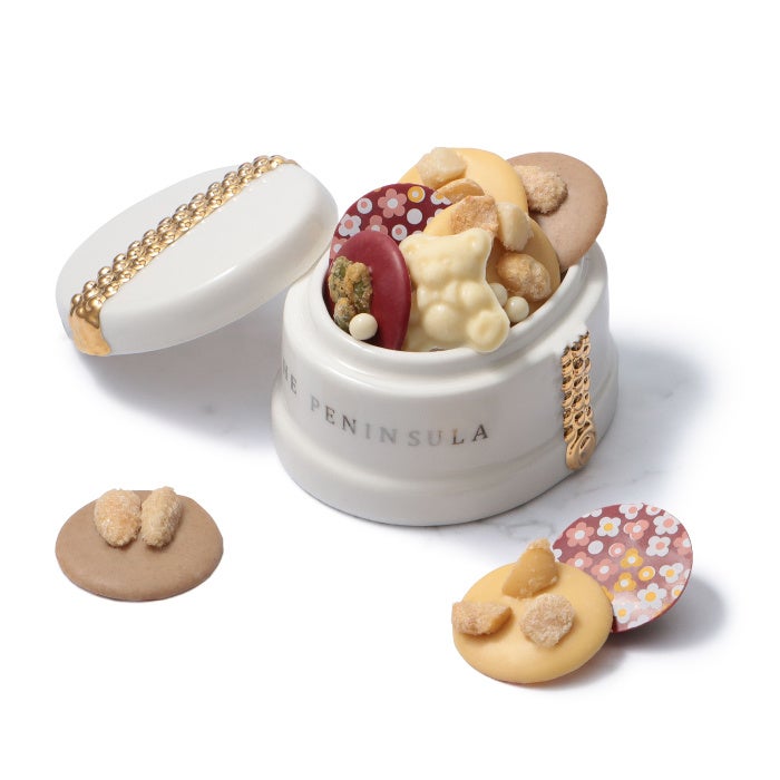 ザ・ペニンシュラのアイコン的スタッフ“ページ”の帽子をイメージした艶やかな陶器の器の中に、ナッツを合わせたマンディアンチョコレートや可愛いベアチョコレートを閉じ込めました。ストロベリーやパッションフルーツのチョコレートに、ピスタチオやマカダミアナッツを合わせ、爽やかな甘みと食感をお楽しみいただけます。カラフルなフラワープリントが華やかさを添え、お祝いのギフトとしても最適です。