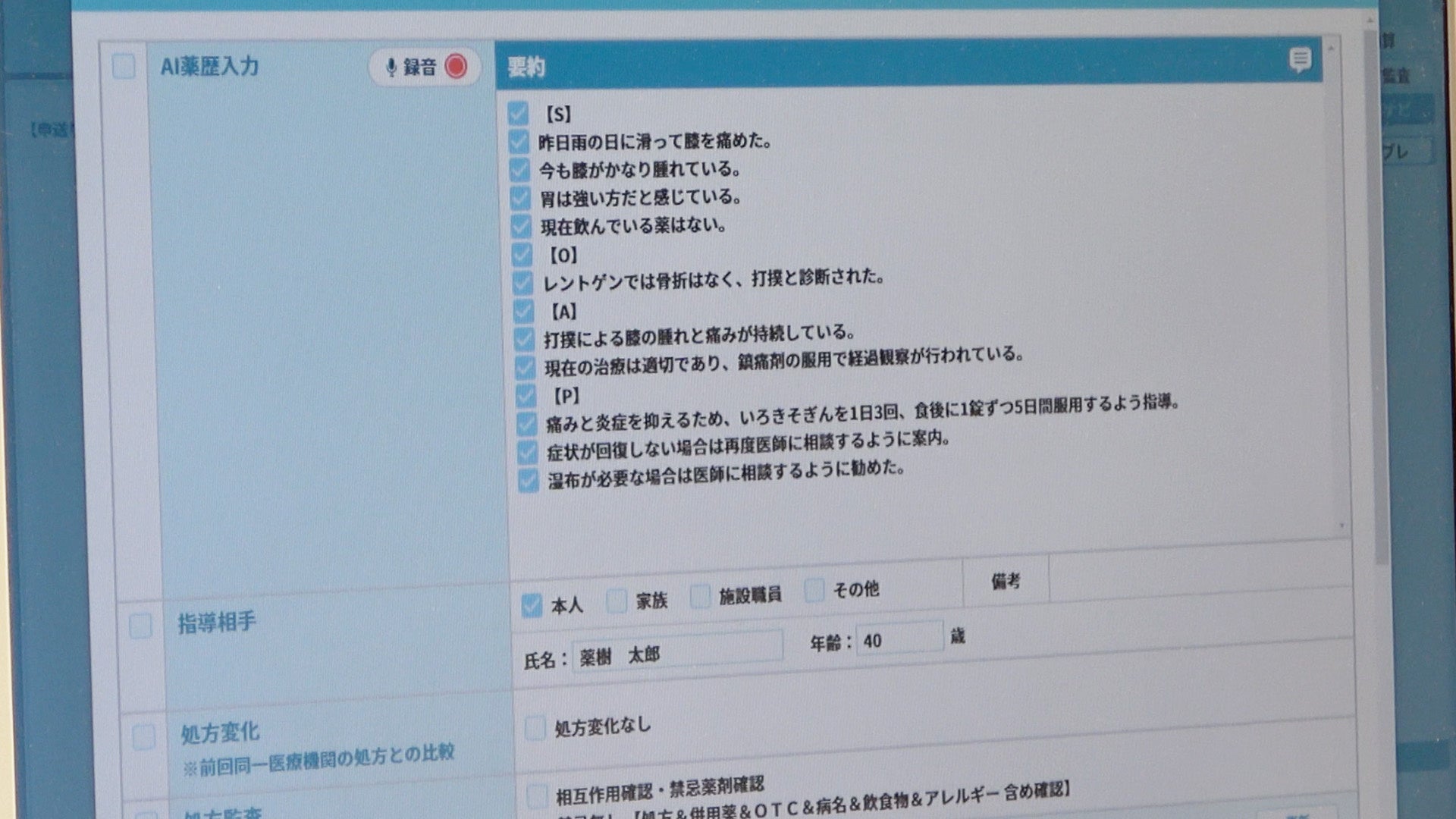 「AI音声入力」は、薬剤師と患者さまの会話を音声認識し、SOAP形式で薬歴(薬剤服用歴)を自動作成する国内初のAI薬歴作成支援サービスです。