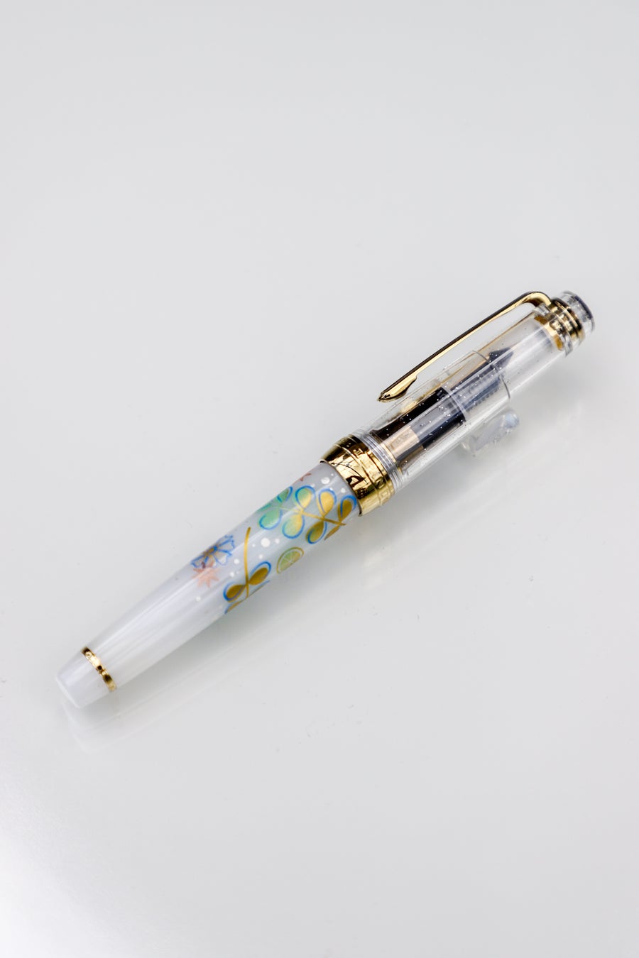 「#24」万年筆は、この香りを構成する植物を加賀の印刷蒔絵という手法で、美しくかつ煌びやかに表現したものです。半透明の白色のボディに、#24の香りでブレンドされた植物の紋様が浮かび上がります。