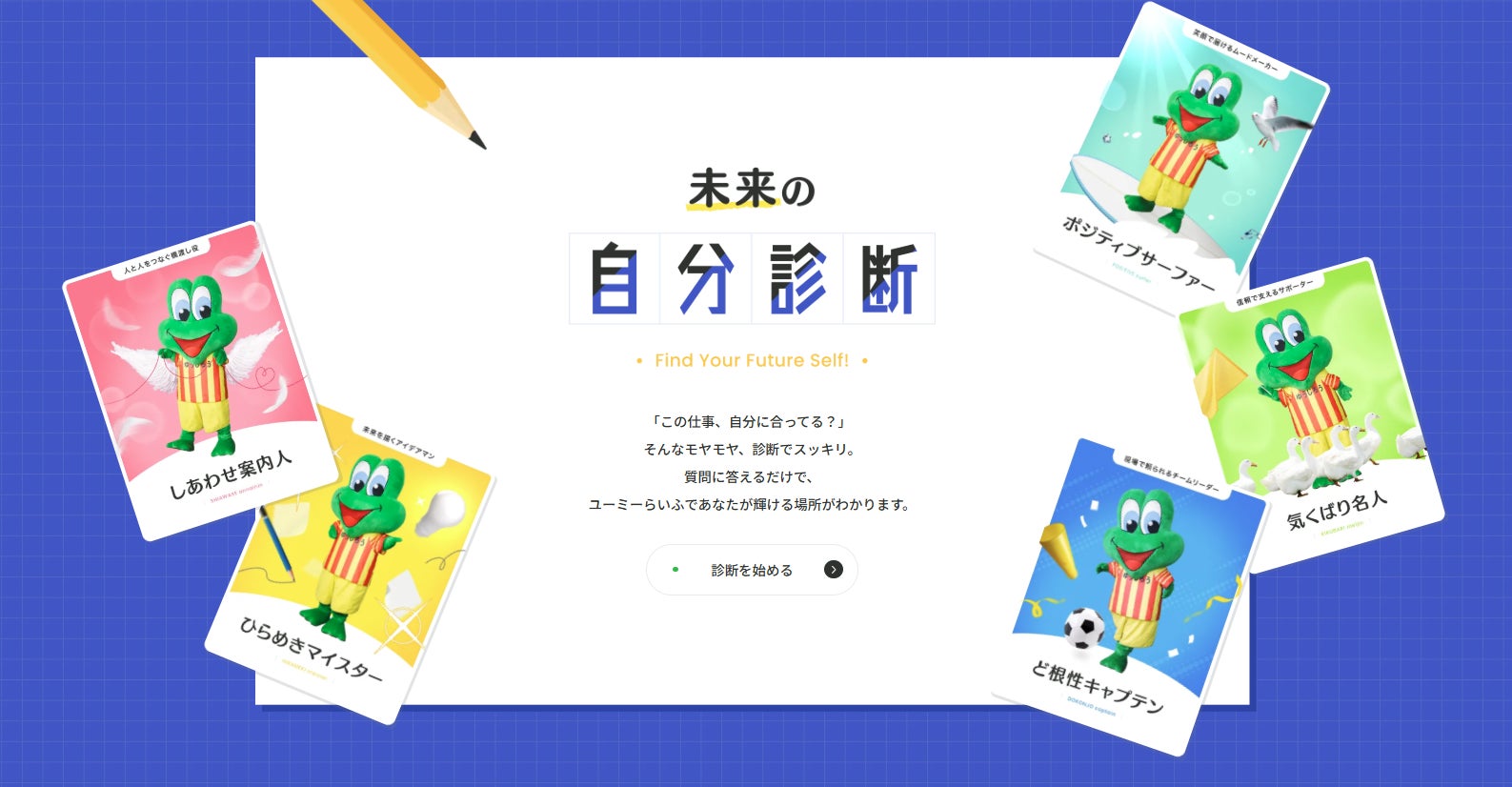 長年親しまれてきた愛されキャラクター「ゆうじろう」が、会社案内役としてサイト全体に登場。ユーミーの歴史を知り尽くした彼がガイド役となり、可愛らしく、安心感のあるトーンで会社を案内します。