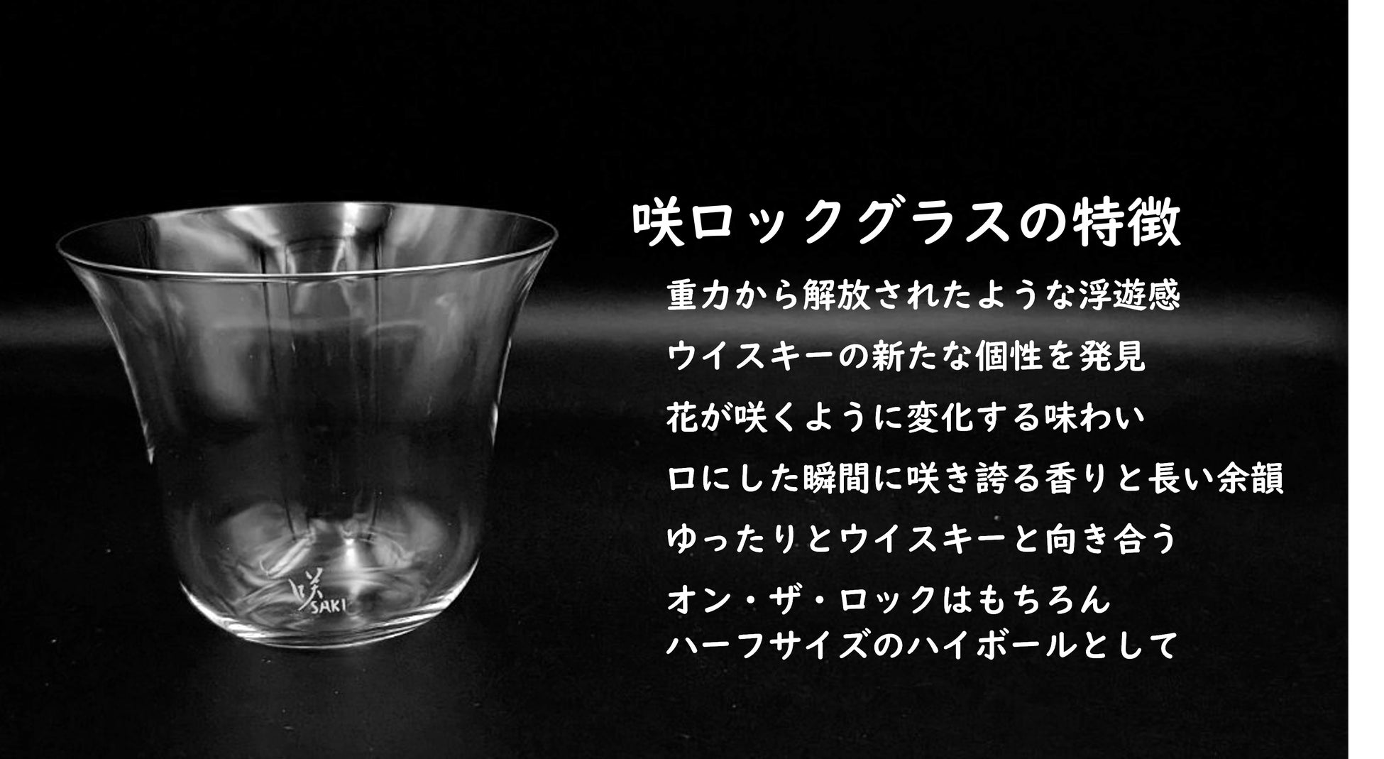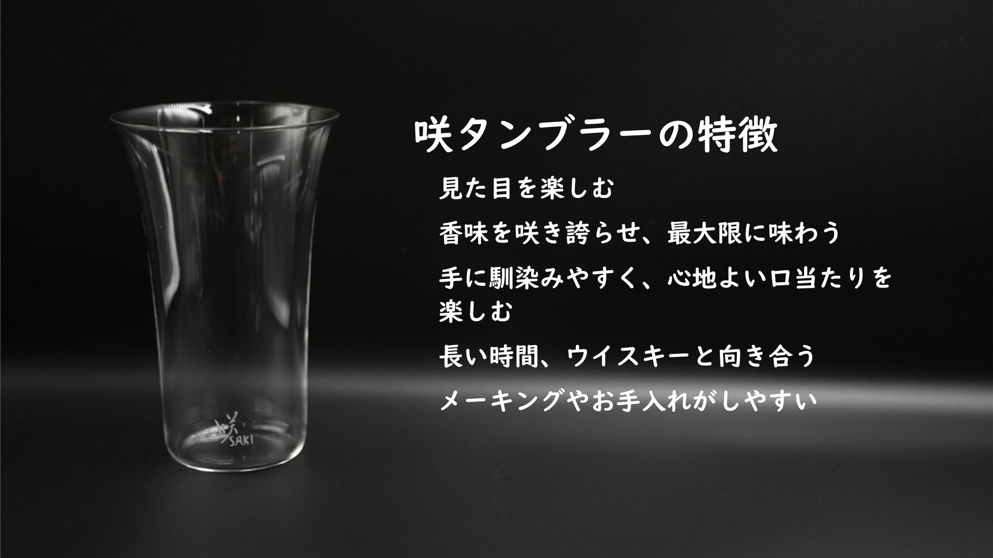 咲くには開花するという意味があり、ウイスキーの「香りを咲き誇らせる」ようなグラスにしたいという想いにぴったりな意味合いと考えて名付けられました。また、「咲」と書いて「えみ」と読むことが知られております。「咲(SAKI)グラス」を使って「笑み」が満開になっていただければという想いも込められています。