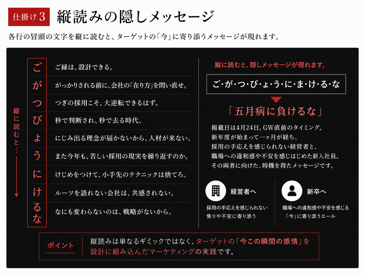 一見シンプルな縦書きコピーの連打で構成されていますが、その内部には3つの独立した仕掛けが設計されており、本リリースにてその構造を全公開いたします。