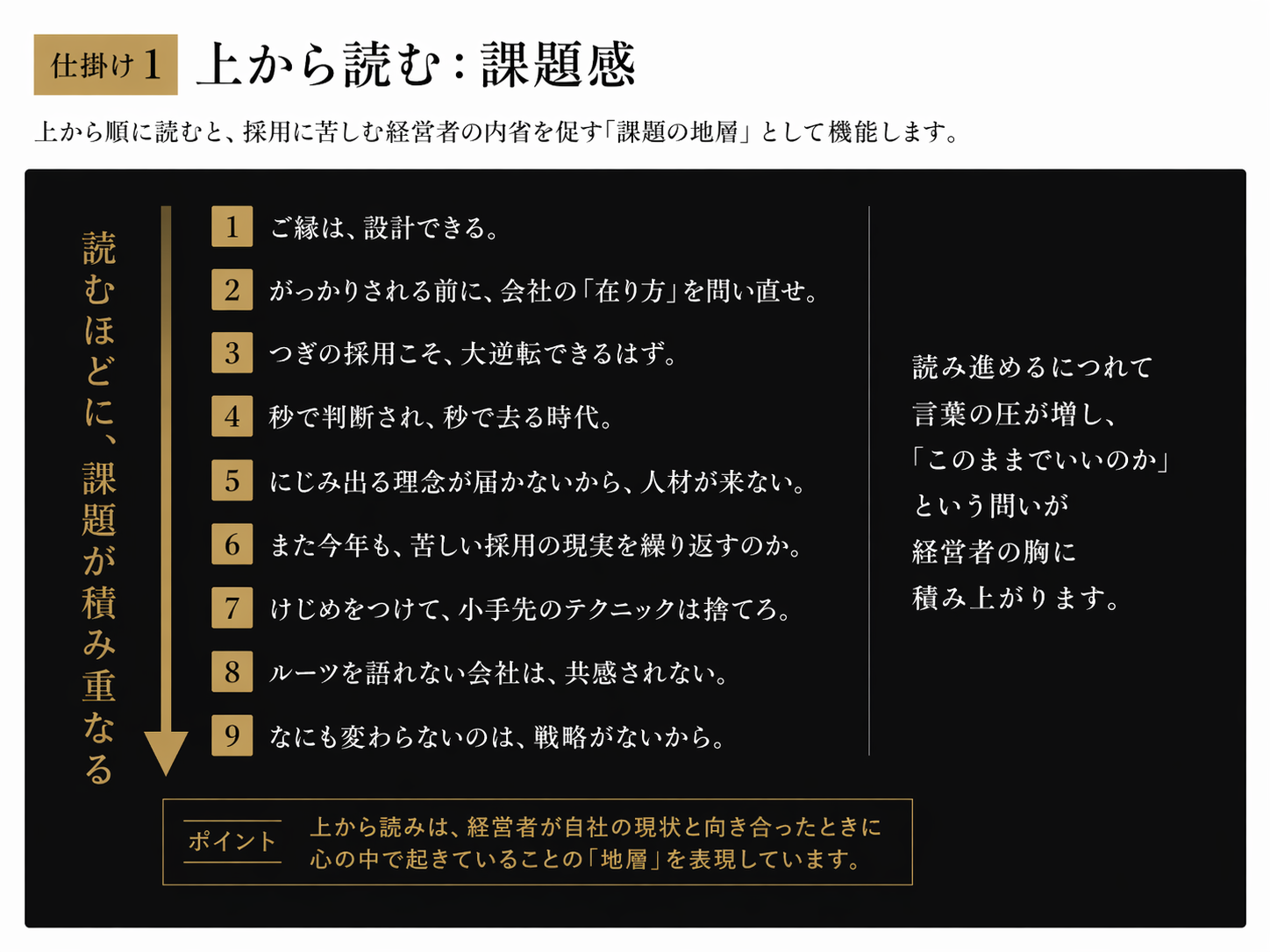 広告のコピーを上から順に読むと、採用に苦しむ経営者の内省を促す「課題の地層」として機能します。