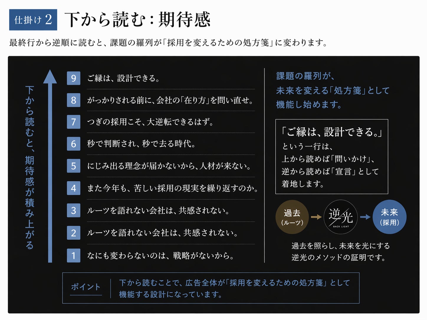 同じコピーを最終行から逆順に読むと、まったく異なる文脈が浮かびあがります。