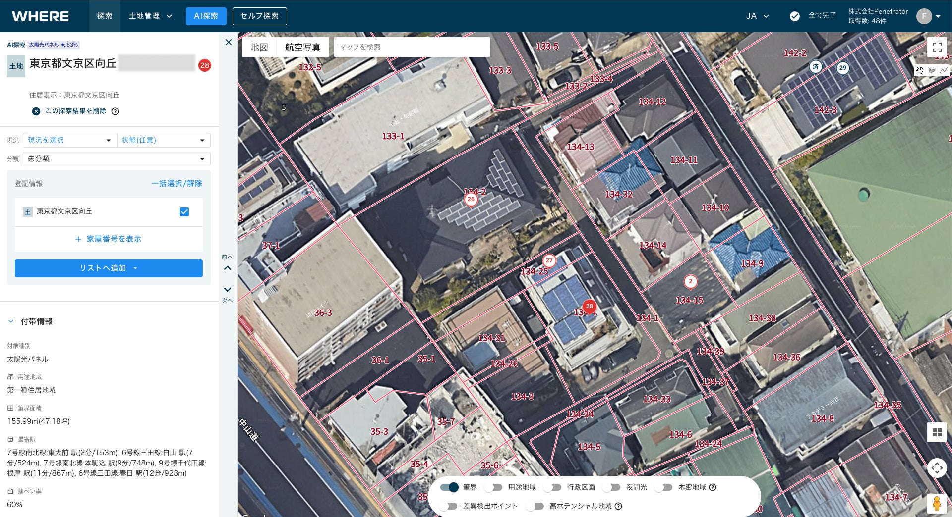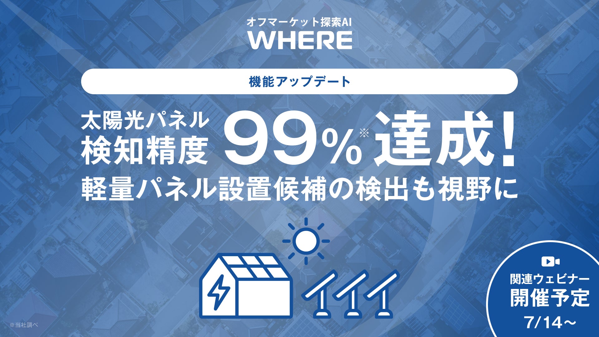 株式会社Penetrator(本社:東京都文京区、代表取締役CEO:阿久津 岳生、以下「Penetrator」)は、宇宙から用地仕入れの常識を変えるオフマーケット探索AI『WHERE』において、AIによる太陽光パネルの検知機能を新たに実装し、検知精度99%(社内検証)を達成したことをお知らせします。これは、日本政府が2026年度から導入を義務付ける「工場・店舗等への屋根置き太陽光設置目標」に対応する先進的なソリューションであり、全国1.2万事業者における太陽光パネル導入の意思決定を加速させるインフラとなります。