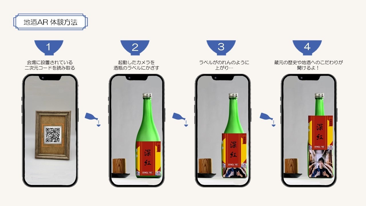 二次元コードを読み取り、地酒の酒瓶ラベルをスマートフォンのカメラにかざすと、ラベルデザインがのれんのように上がり、昔ながらの雰囲気ある酒蔵に佇む担当者が笑顔で出迎えてくれます。まるで目の前で話しかけられているように、蔵元の歴史や製造する地酒のこだわりについて語る担当者が立体感のある酒蔵の中で流れ、さながら酒蔵見学ツアーに参加しているような臨場感あふれる体験ができます。