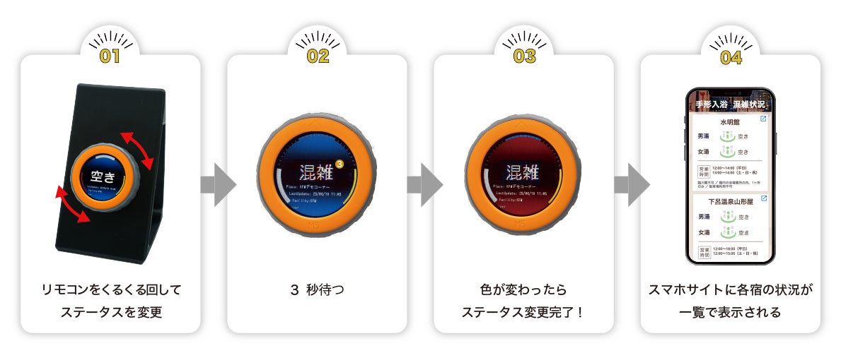 今回導入された「手形くるくる」は、甲南キッチンが提供する混雑状況発信システム「asagotta vista(アサゴッタ・ヴィスタ)」を利用したものです。各温泉施設にダイヤル式リモコンを設置し、旅館スタッフが「くるくる回すだけ」で混雑状況を簡単に設定できます。設定された情報は即時でホームページに一覧表示され、利用客はリアルタイムで各施設の混雑状況を確認できるようになります。