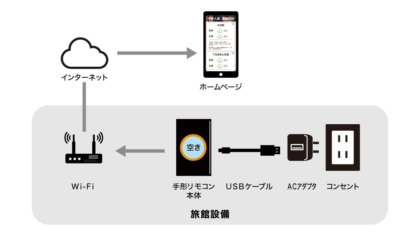 また、旅館に必要な設備は電源コンセントとWi-Fiのみで、工事不要です。「手形くるくる」にUSBケーブル・ACアダプタ接続し、コンセントに繋ぐだけで利用できる簡易な構造のため、ITシステム運用に不安のある旅館にもおすすめです。