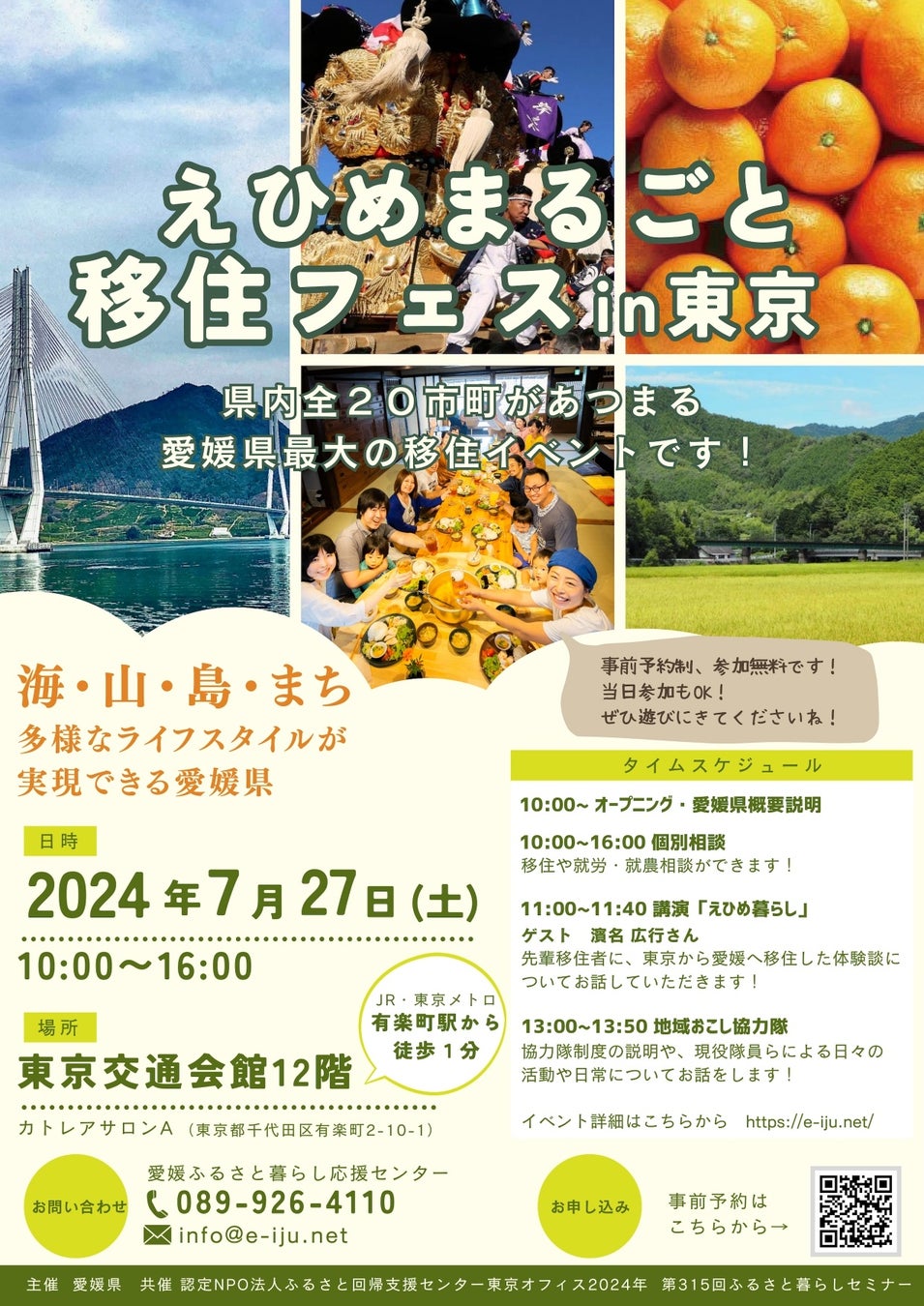7月27日(土)10:00から、東京都千代田区有楽町の東京交通会館12階において、愛媛県最大の移住イベント「えひめまるごと移住フェスin東京」が開催されます。