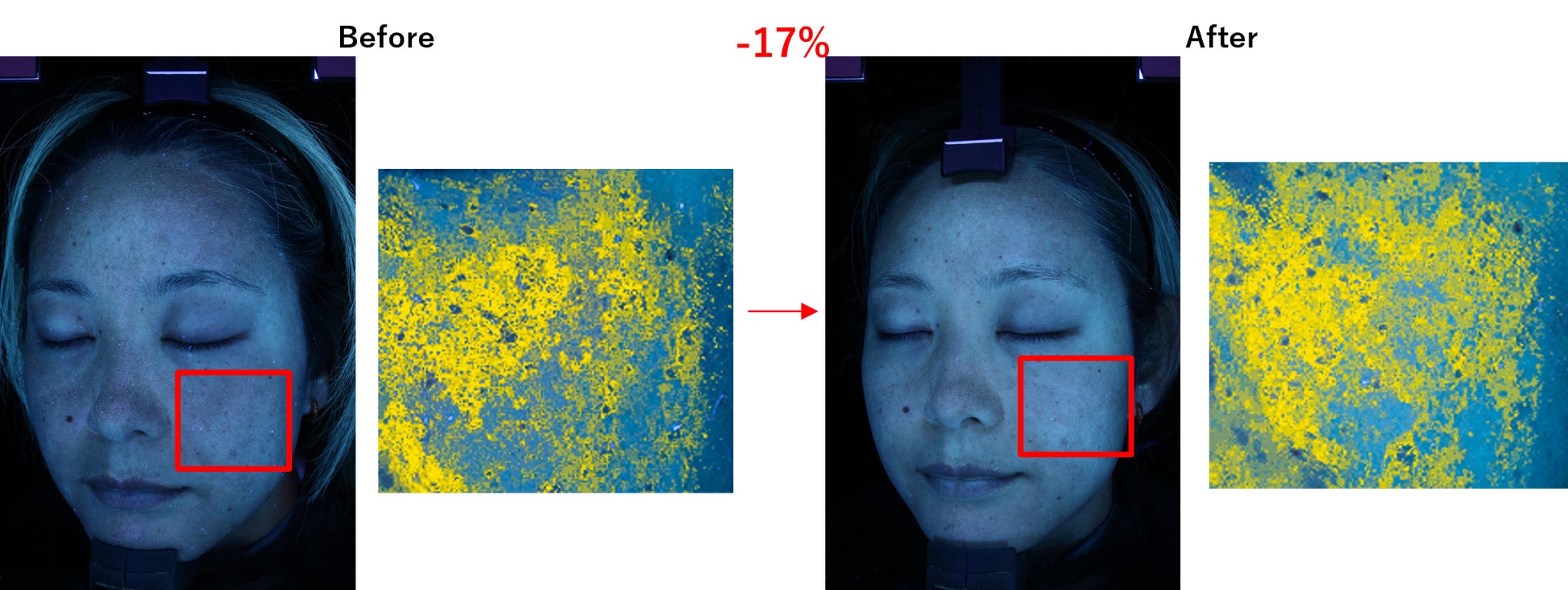 今回のモニター調査の結果、サーファー1名を含む7名中6名の隠れジミが平均で13.4%改善、最大22%改善された結果が見受けられました。サーファーの女性の場合、9月時点で隠れジミは顔全体にあり、特に両頬に多く見られましたが、今回の調査ではその頬にあった隠れジミが薄くなっていることが確認されました。
