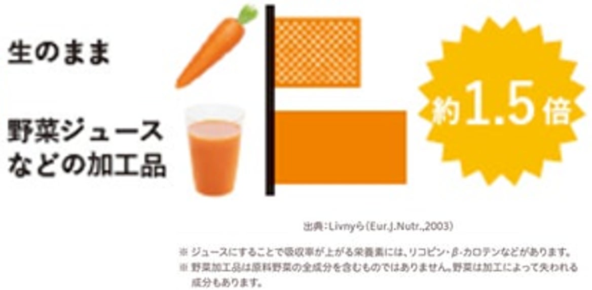 生野菜と比べると加工した野菜は栄養成分が減少してしまうというイメージが強いですが、β-カロテン成分は野菜ジュースにすることで逆に吸収率が高まる栄養素であることがわかっています。