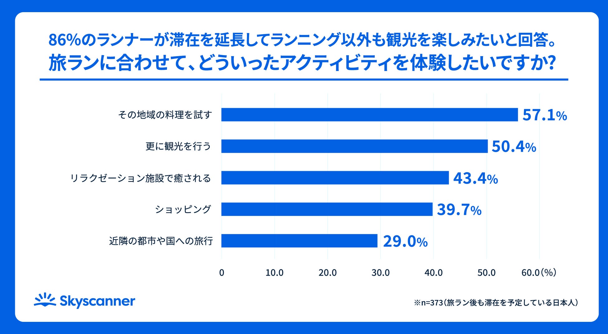 最後に、旅ランではランニング以外にどういった楽しみ方をしたいと考えているのか、を調査いたしました。「旅ランを計画する場合、どのくらい滞在を延長して観光を楽しみたいと思いますか?」という質問に対して、約86%が1日以上滞在を計画したい、と回答する結果に。更に体験したいアクティビティについても質問を行ったところ、「その地域の料理を試す」(57%)、「更に観光を行う」(50%)、「リラクゼーション施設で癒される」(43%)が上位を占める結果に。これらの結果からも、目的型の旅行ならではの、走るだけでは終わらず旅行先で更に楽しもうとするスタイルが定着しています。
