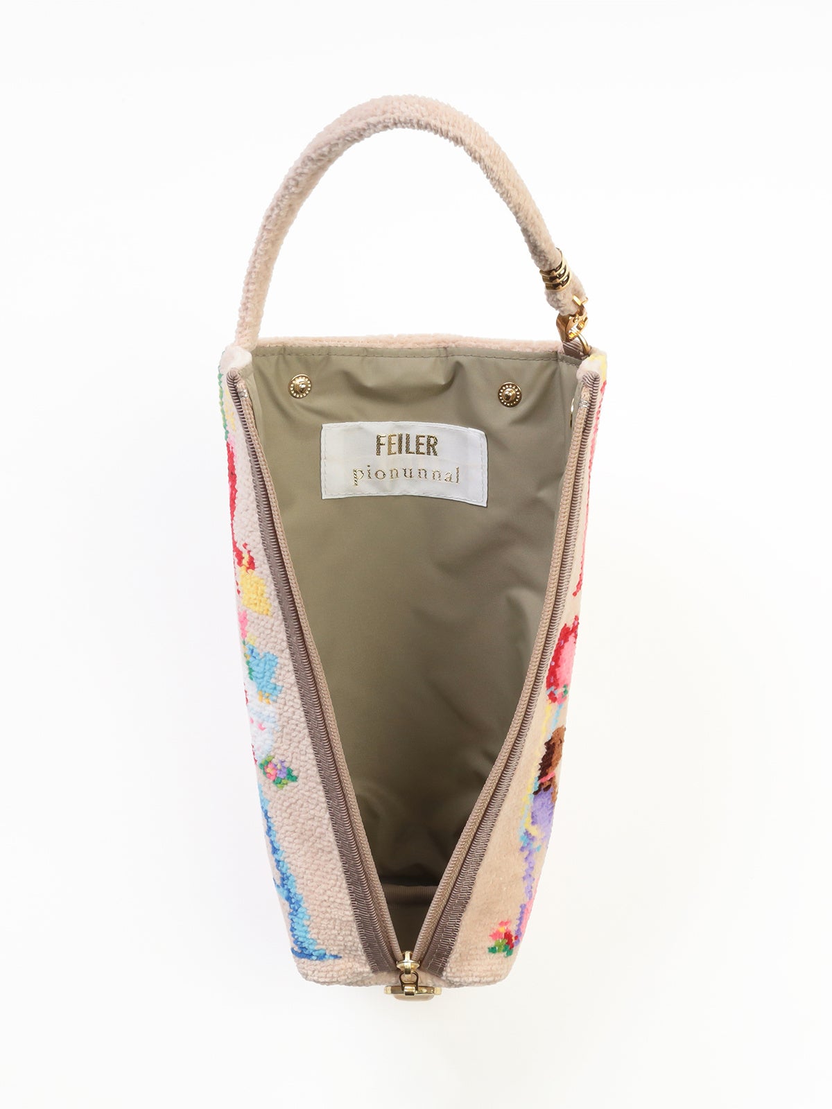 前面はフェイラーの人気柄「ジョイフル」をもとに、ピオヌンナルのアルファベットを1文字ずつ取り入れたオリジナルデザインのシュニール織仕立て。側面や背面はピオヌンナルのヌビ素材で仕上げて、コラボレーションならではの魅力たっぷりなルックスに。500mlのペットボトルがすっぽり収まり、内ポケットも付いて整理整頓もスムーズ。お出かけがより楽しくなりそうな雰囲気のアイテムです。