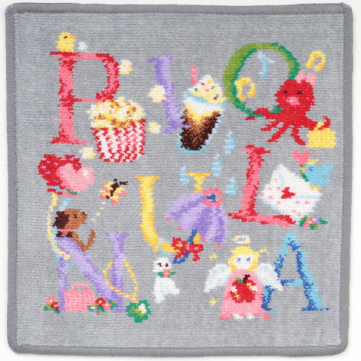 フェイラーの人気デザイン「ジョイフル」をもとに、ピオヌンナルのアルファベットを1文字ずつ取り入れたオリジナルデザイン。コラボレーションならではのスペシャルな表情に仕上げました。アルファベットとモチーフを結びつけながら、お子さまと一緒に言葉遊びも楽しめる1枚です。上記写真のハンカチのカラーは、ピオヌンナル公式オンラインショップ限定です。