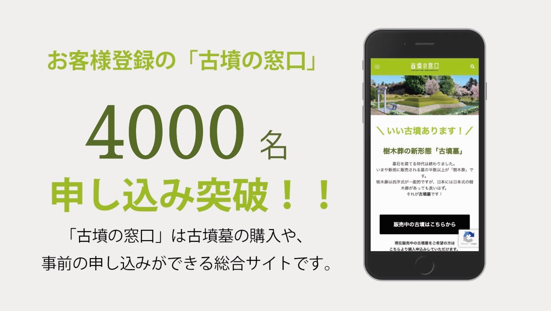 さらに、当社が運営する『古墳の窓口』は、終活や古墳に興味を持つ多くの方々から大反響を呼び、サービス開始からわずか3ヶ月で4,000人以上の申込を達成いたしました。このサービスは、古墳墓の購入を検討している方々に向けて、購入までの一連の流れをサポートする窓口になります。