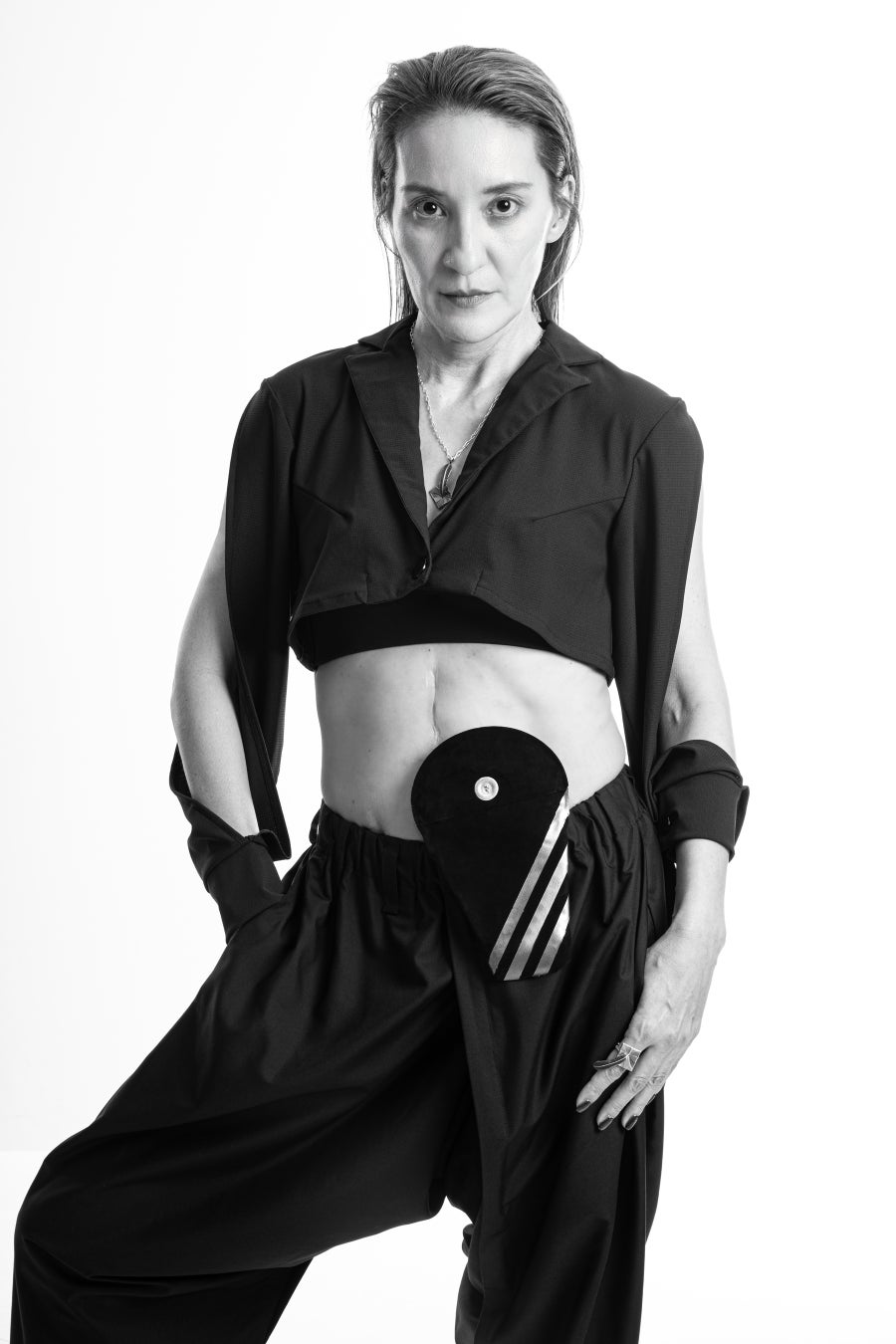 私はこれまでオストメイトモデルとして、ストーマの認知向上と、当事者が前向きに受容していくための啓蒙活動を中心に活動を続けてまいりました。 しかし、真の〝モデル〟とは、芸術作品が投影されて初めて具現化するものだと考えています。 この度、日本福祉医療ファッション協会様のデザインの素晴らしい衣装と〝デザイナーズパウチ〟という世界初のコラボレーションに、モデルとして関わらせていただき、オストメイトであってもファッションを諦める必要はない、むしろパウチがアクセントにさえなる――。 そのような、これまでの常識を大きく覆すチャレンジングで斬新なプロジェクトに、心の躍動を抑えきれません。