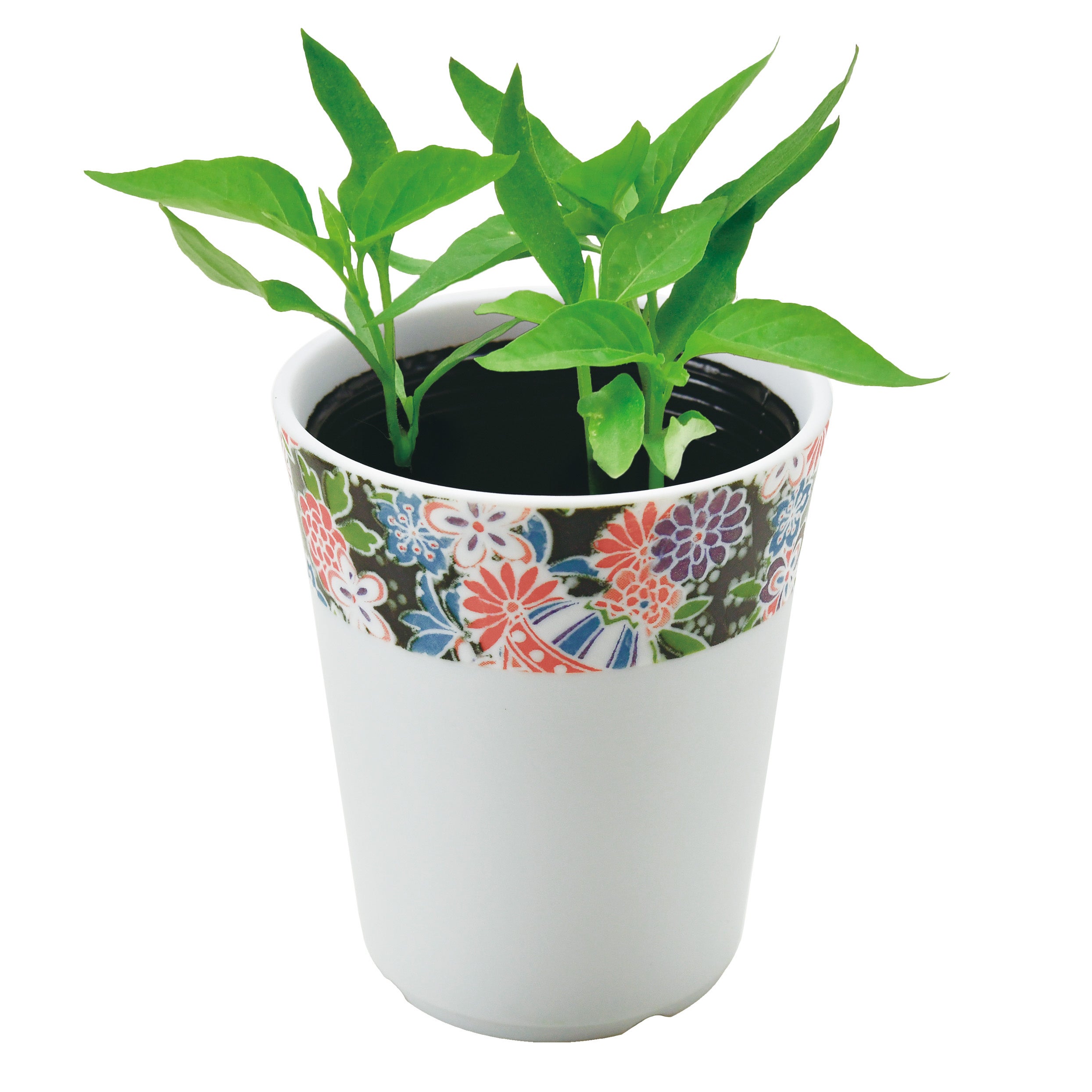 白い陶器に、黒を基調とした帯状の友禅柄をあしらい、赤、水色、グリーンがスタイリッシュな印象のデザイン。そんな器で育てるのは、日本の食文化に欠かせない薬味「唐辛子」です。