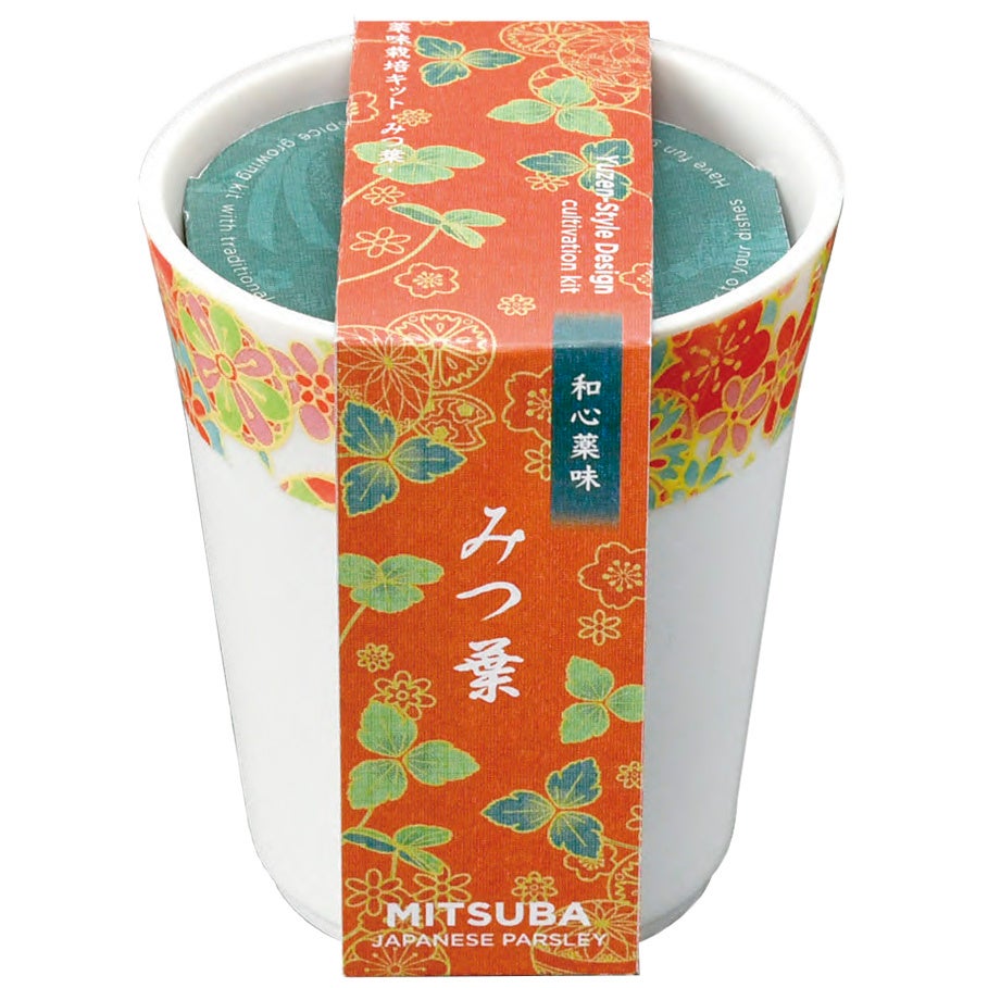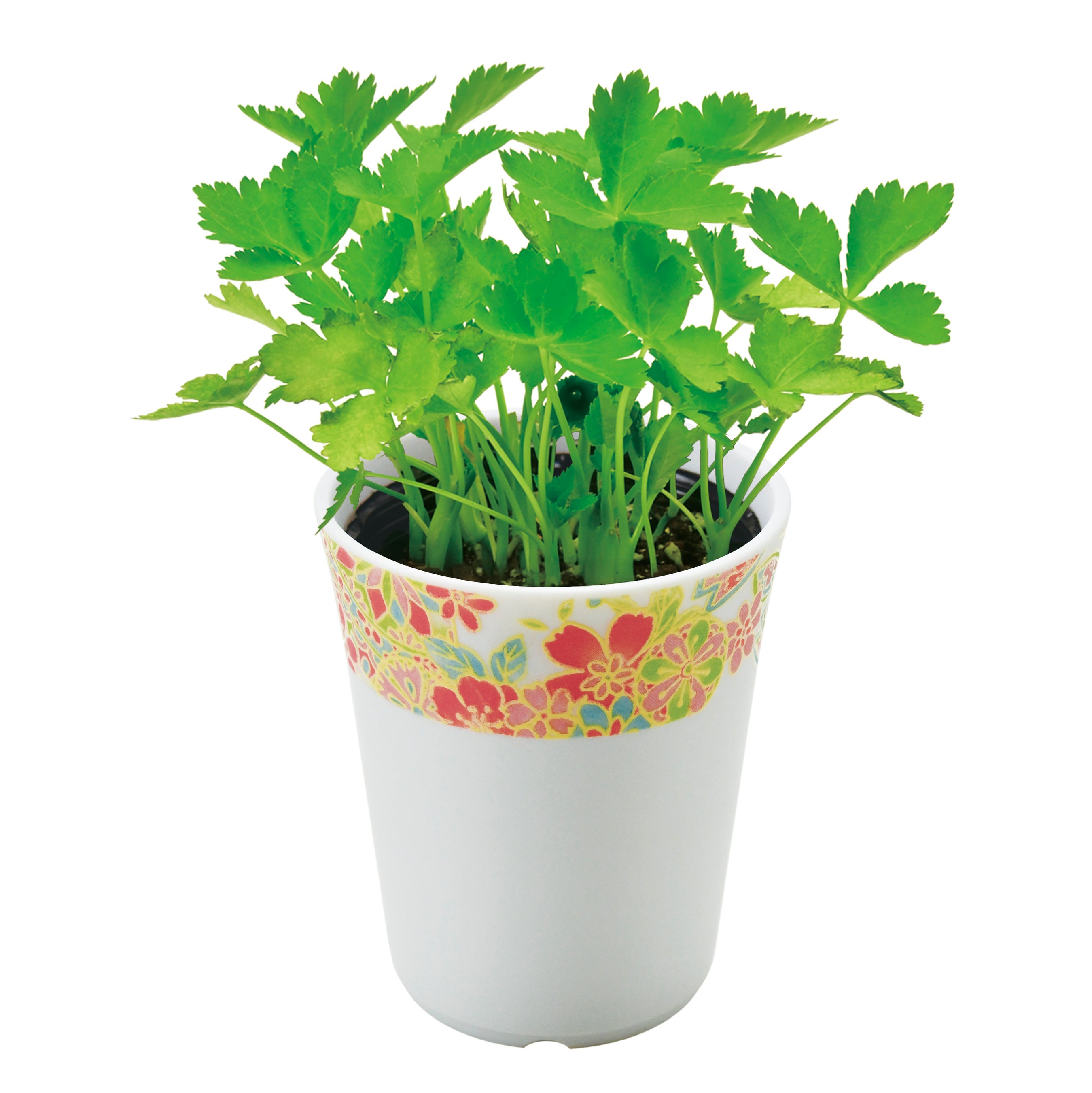 白い陶器に、オレンジを基調とした帯状の友禅柄をあしらい、黄色のラインとやさしいピンク、黄緑の差し色が明るくやわらかな雰囲気を演出。そんな器で育てるのは、日本の料理にさりげなく香りと彩りを添える「ミツバ」です。