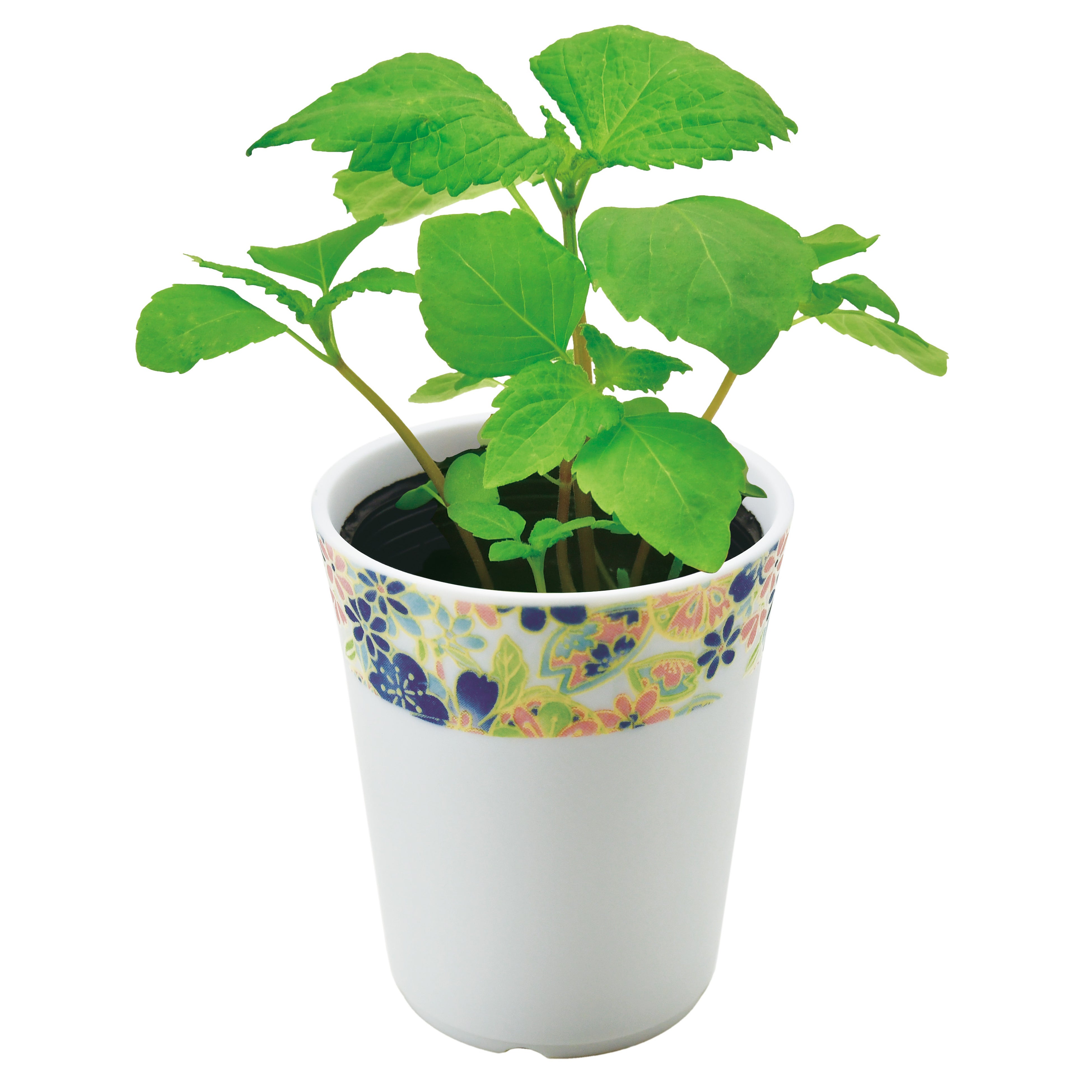 白い陶器に青を基調とした帯状の友禅柄をあしらい、黄色のラインとやさしいピンク、水色を効かせた華やかなデザイン。そんな器で育てるのは、日本の食卓に欠かせない薬味「しそ」です。