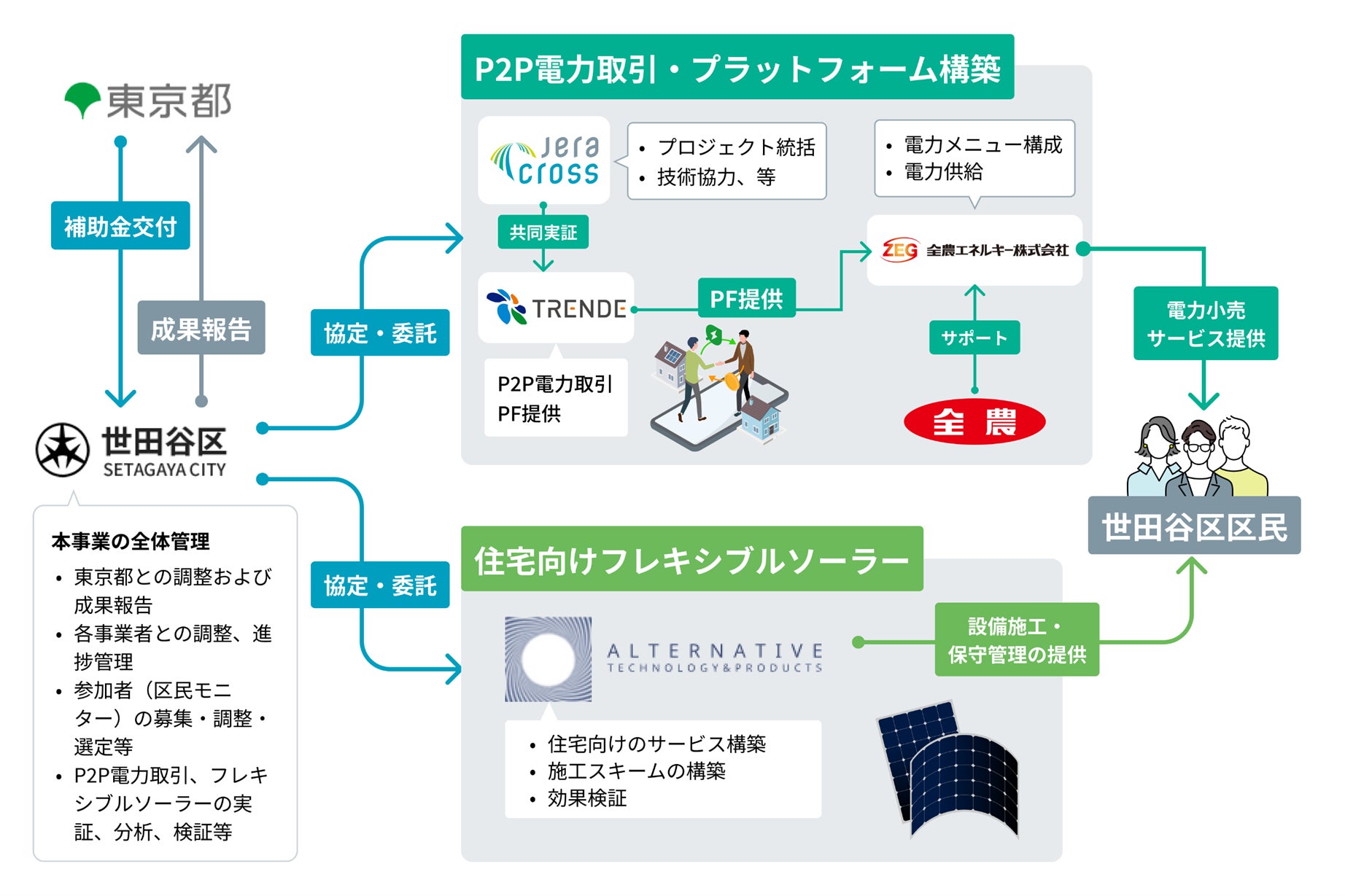 TRENDE株式会社(以下「TRENDE」)と株式会社JERAの子会社である株式会社JERA Cross(以下「JERA Cross」)は、このたび、世田谷区、全国農業協同組合連合会、全農エネルギー株式会社(以下「全農エネルギー」)と連携・協働し、世田谷区内での住宅用太陽光発電の余剰電力を活かした地域内エネルギー循環の実証事業(以下「本実証事業」)を開始することをお知らせします。