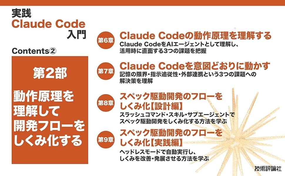 第2部ではAIエージェントとしてのClaude Codeの動作原理を理解し、意図通りに動かすための問題切り分け方法や、スラッシュコマンド・スキルの設計方法を解説しています。