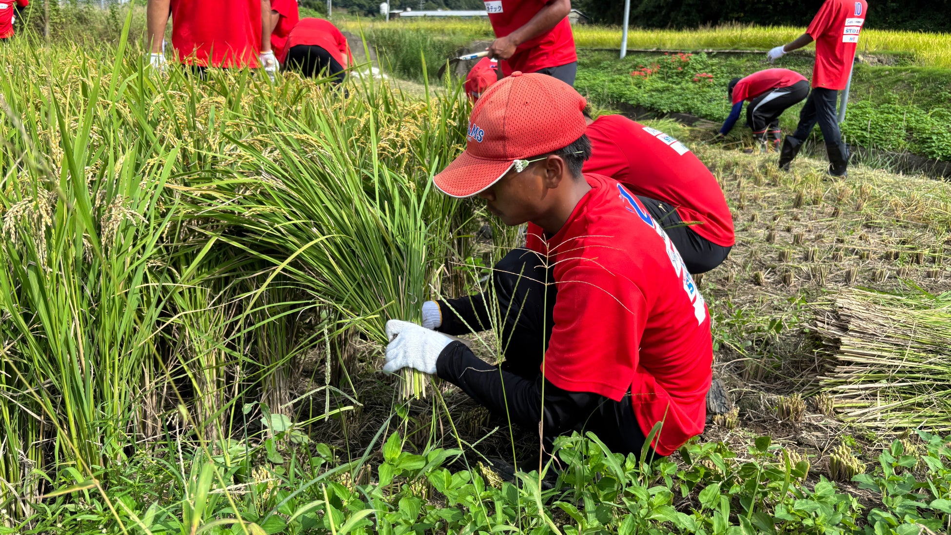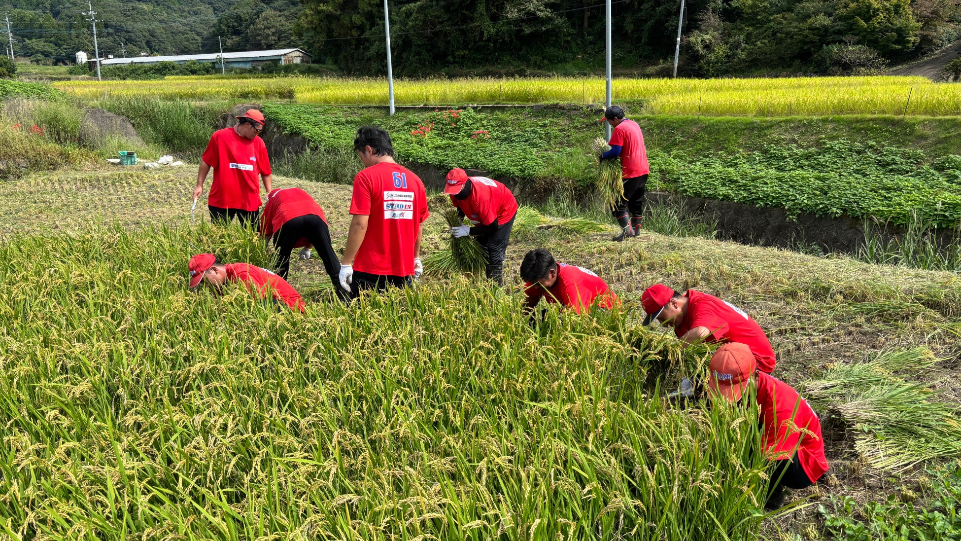 耕作放棄地で機械が入れない田んぼのため、手刈りでの収穫を実施しました。