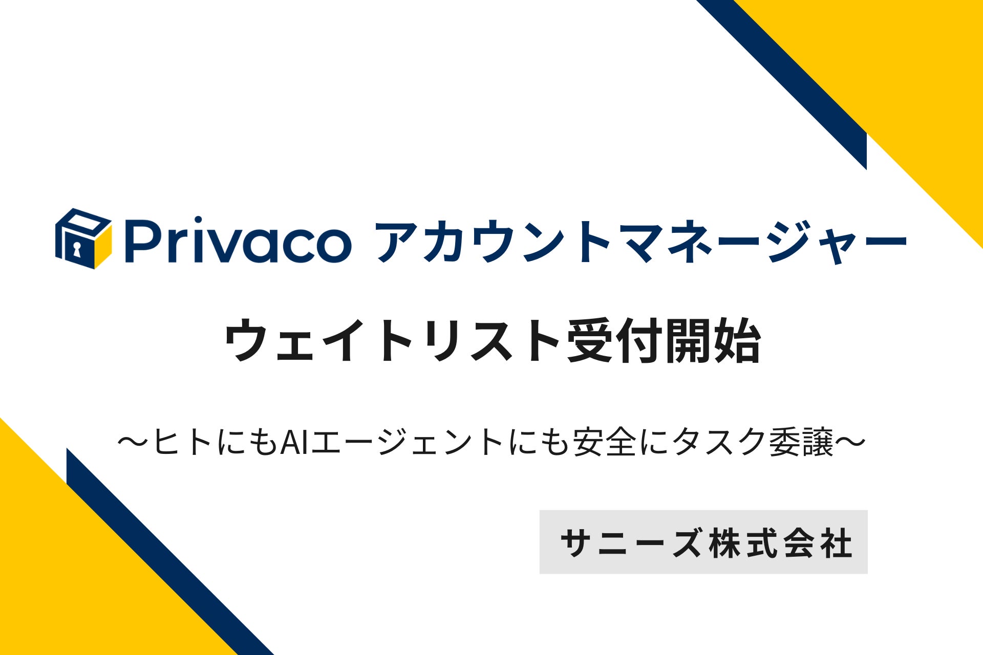 サニーズ株式会社(本社:東京都千代田区、代表取締役:中澤 望、以下「当社」)は、AIエージェントやチームメンバーに対して安全にアカウント操作を委譲できる新サービス「Privaco(プライバコ) アカウントマネージャー」のウェイトリスト受付を、本日より開始しました。