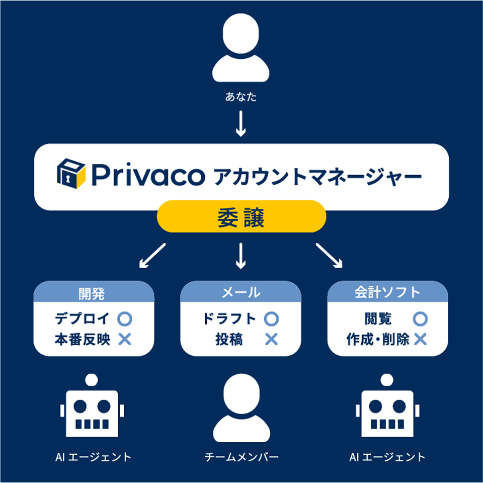 「Privaco アカウントマネージャー」は、パスワードなどを直接共有することなく、操作権限のみを安全に委譲できる仕組みを提供します。