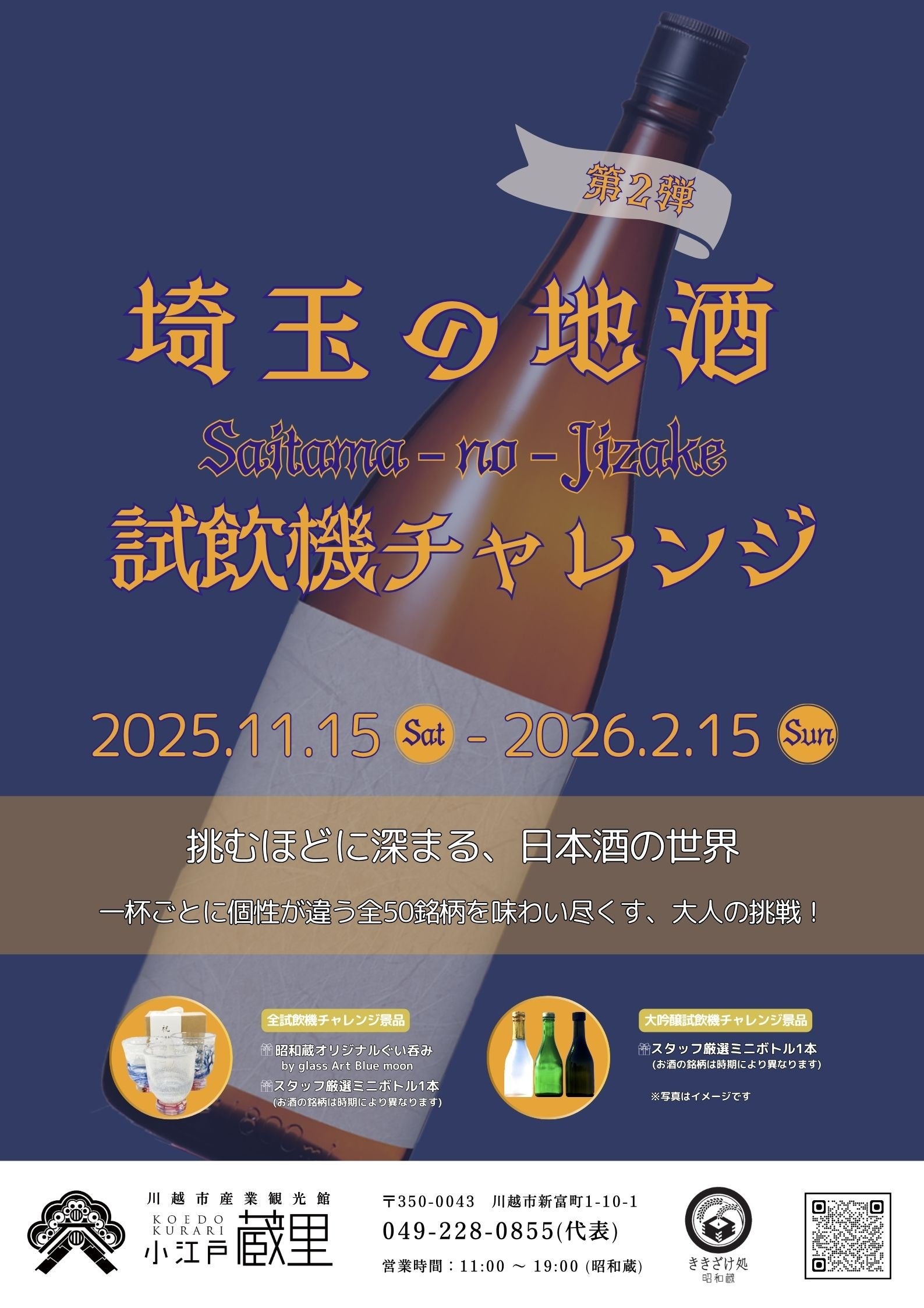 「埼玉の地酒 試飲機チャレンジ 第2弾」を開催いたします。埼玉県全酒蔵から厳選した50 種類の日本酒を制覇して、限定景品を手に入れる特別な体験をお楽しみください!