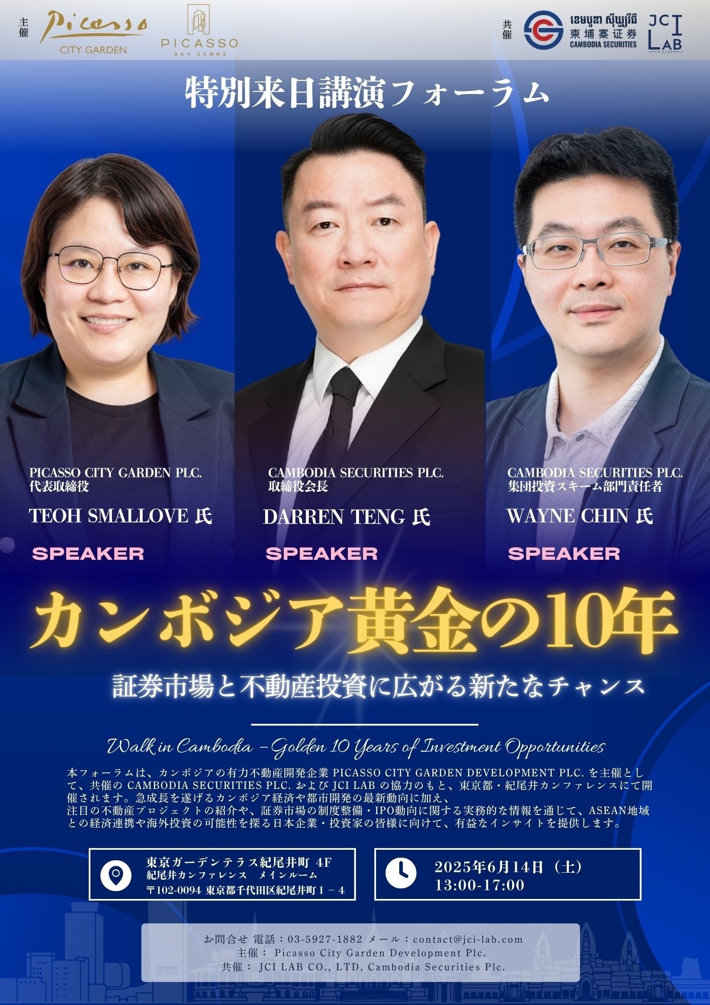 本フォーラムは、カンボジアの有力不動産開発企業 Picasso City Garden Development Plc. を主催とし、JCI LABおよびカンボジアの主要証券会社 Cambodia Securities Plc. の共催のもとで開催されます。現地の都市開発や証券市場の最新動向を、日本の企業・投資家の皆様に直接お伝えする貴重な機会となります。