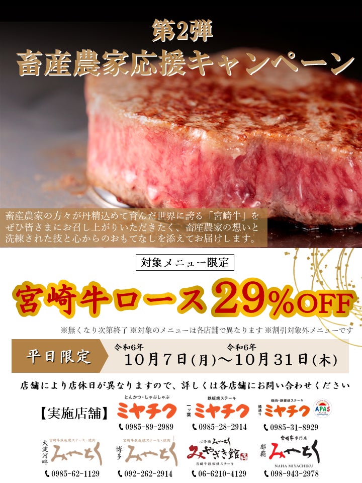 株式会社ミヤチク(本社:宮崎県都城市/代表取締役社長:船ヶ山 祐二)が運営する【ミヤチクレストラン(宮崎県内4店舗、福岡県・大阪府・沖縄県各1店舗ずつ)】にて、平日限定で宮崎牛ロースを使用した対象メニューが29%OFFとなる大変お得なキャンペーンを開催中です。無くなり次第終了となりますので、この機会にぜひ至高の宮崎牛をご堪能下さい。