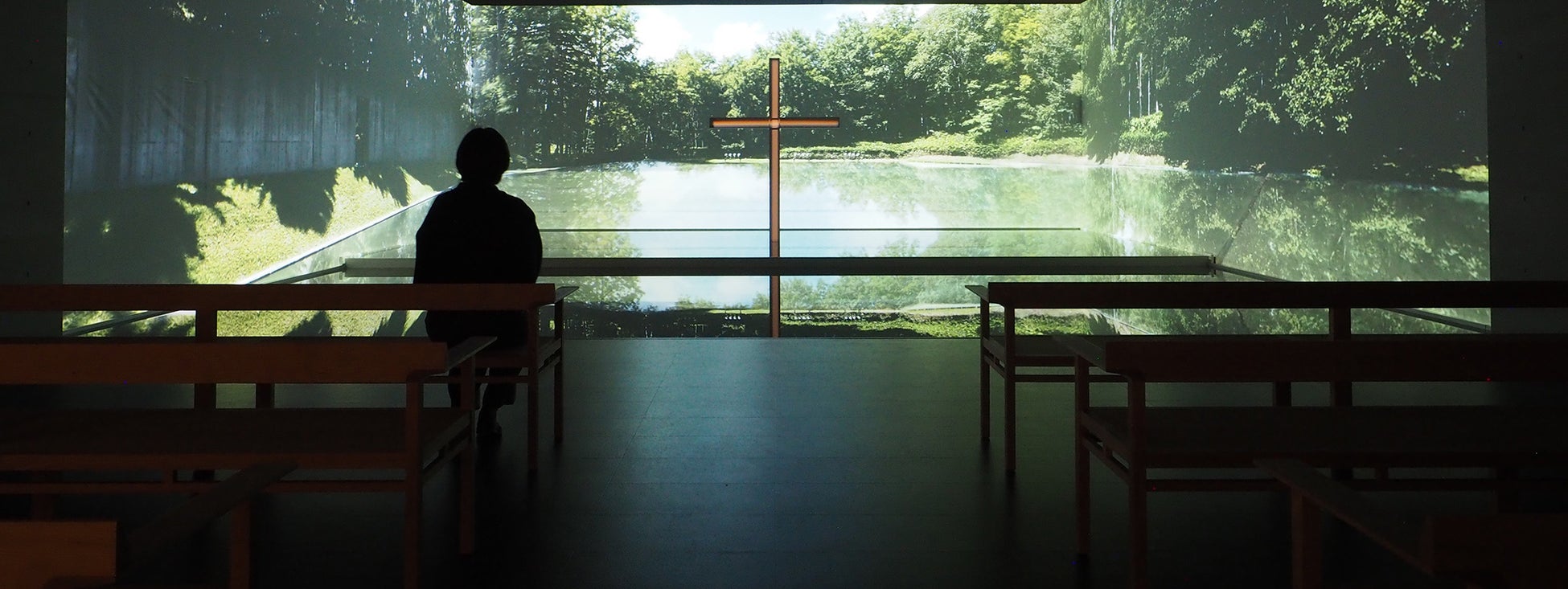 インスタレーションでは、安藤忠雄氏の初期代表作にして、教会3部作のひとつ「水の教会」を原寸大で再現。北海道の雄大な自然を背景として水上に十字架が浮かぶ情景を、パノラマ映像と、実際に水を張った水盤でリアルに再現することで、遠く北海道の建築空間を会場で体感することができる。