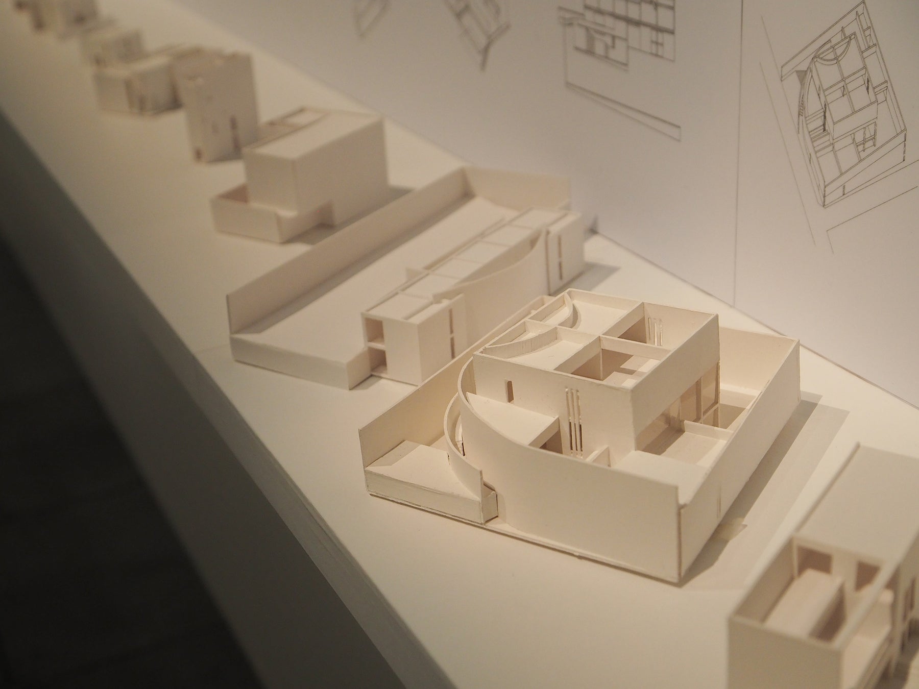 長い壁で仕切られた通路には、安藤氏の全住宅作品から選りすぐった70の住宅模型が並ぶ。